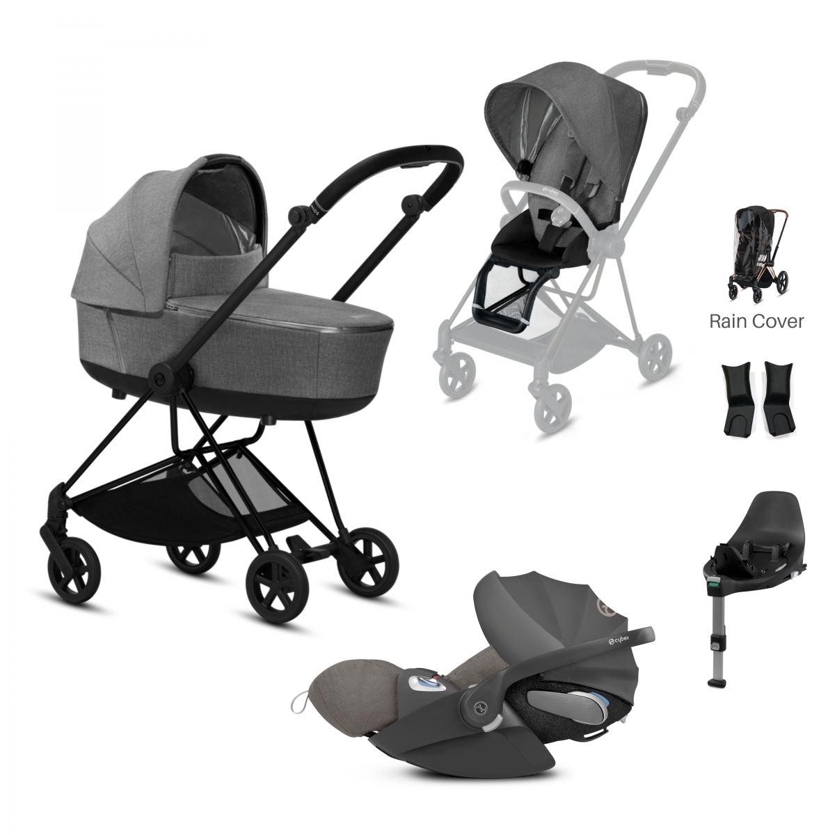 PRODUCT INCLUDES: Cybex Mios Black Chassis Cybex Mios Seat Unit Cybex Mios Lux Carry Cot Cybex Cloud Z Car Seat Cybex Base Z-Black CYBEX MIOS BLACK CHASSIS: The Chrome Mios Chassis with All Terrain is a fantastic pushchair chassis, it includes features that parents will adore and a smooth ride for your little one. Features: Foot brake which is easy to use XL and extendable shopping basket Universal adaptor (for Mios attachments incl seats) Light Aluminium frame which is light yet stable Wheels are never flat thanks to the foam filling Height adjustable handlebar – made from high quality leather-like material Rotatable seat unit ? choose from forward or backwards facing with the Lux or 2-in-1 seat One-hand fold mechanism ? fold with one hand and can be stored in small places Compatible travel system ? add the Cybex Cloud Z or Aton car seat onto the Mios Chassis by using the car seat adaptors (which come with the Lux Seat, 2-in-1 Seat and Carrycot) Dimensions: Weight: 8. 1kg CYBEX MIOS SEAT UNIT: The Cybex Mios 2 in 1 seat unit will attach to any of the Cybex Mios pushchair chassis (sold separately) in either a rear-facing position so younger babies can see mum and dad and interact, or turned to a forward facing position so older children can look out and see the world around them. The Cybex Mios 2 in 1 seat is easy to convert in to a carrycot mode making it suitable from birth and is fully reclinable using just one hand. Newborns and very young babies can travel in the recommended lie flat position, whilst older babies from 6 months and up can use the seat unit and sit upright to take in the view, or recline slightly back so they can enjoy a nap. The seat unit is placed on the chassis in a higher position meaning it is the correct height to use as a highchair when visiting cafes and restaurants. Features: Suitable from birth in carrycot mode, and 6 month to 17kg (approx. 4 years) when used as a seat Rotatable seat unit: Can be attached to face forward or backward Can