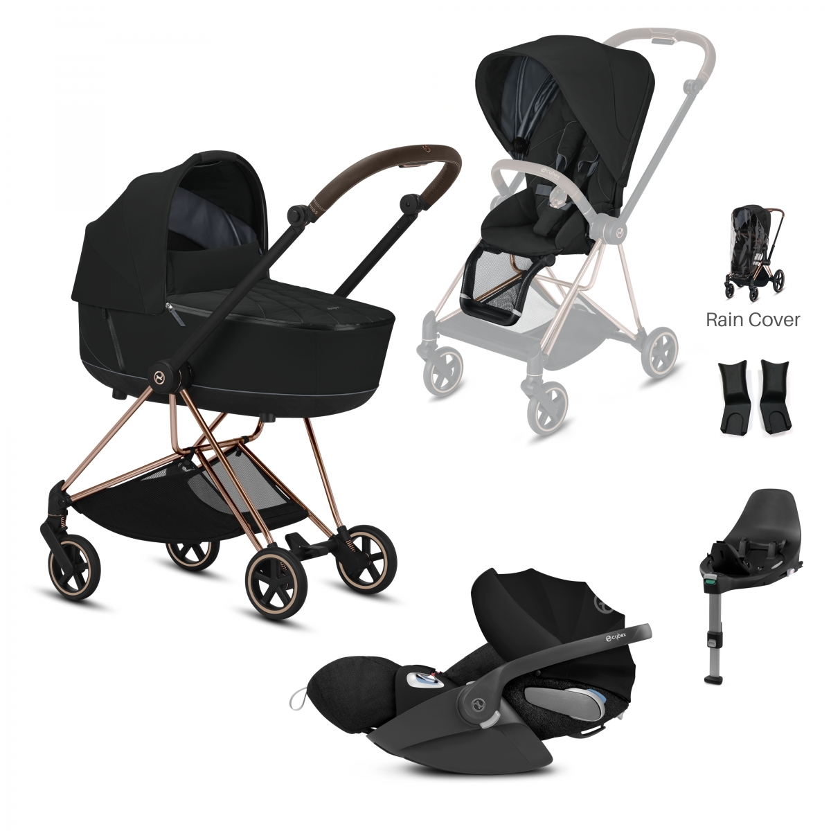 PRODUCT INCLUDES: Cybex Mios Rose Gold Chassis Cybex Mios Seat Unit Cybex Mios Lux Carry Cot Cybex Cloud Z Car Seat Cybex Base Z-Black CYBEX MIOS ROSE GOLD CHASSIS: The Chrome Mios Chassis with All Terrain is a fantastic pushchair chassis, it includes features that parents will adore and a smooth ride for your little one. Features: Foot brake which is easy to use XL and extendable shopping basket Universal adaptor (for Mios attachments incl seats) Light Aluminium frame which is light yet stable Wheels are never flat thanks to the foam filling Height adjustable handlebar – made from high quality leather-like material Rotatable seat unit ? choose from forward or backwards facing with the Lux or 2-in-1 seat One-hand fold mechanism ? fold with one hand and can be stored in small places Compatible travel system ? add the Cybex Cloud Z or Aton car seat onto the Mios Chassis by using the car seat adaptors (which come with the Lux Seat, 2-in-1 Seat and Carrycot) Dimensions: Weight: 8. 1kg CYBEX MIOS SEAT UNIT: The Cybex Mios 2 in 1 seat unit will attach to any of the Cybex Mios pushchair chassis (sold separately) in either a rear-facing position so younger babies can see mum and dad and interact, or turned to a forward facing position so older children can look out and see the world around them. The Cybex Mios 2 in 1 seat is easy to convert in to a carrycot mode making it suitable from birth and is fully reclinable using just one hand. Newborns and very young babies can travel in the recommended lie flat position, whilst older babies from 6 months and up can use the seat unit and sit upright to take in the view, or recline slightly back so they can enjoy a nap. The seat unit is placed on the chassis in a higher position meaning it is the correct height to use as a highchair when visiting cafes and restaurants. Features: Suitable from birth in carrycot mode, and 6 month to 17kg (approx. 4 years) when used as a seat Rotatable seat unit: Can be attached to face forward or backw