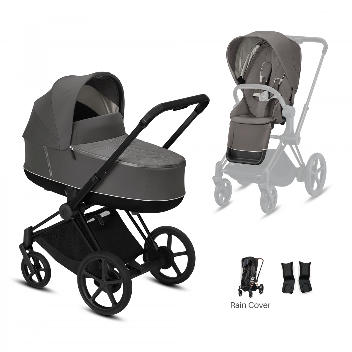 This Package Includes: Cybex e-Priam Stroller Cybex Lux Carrycot Cybex e-Priam Black Chassis All Terrain 2in1 Pram System The 2020 Cybex e-Priam Pushchair offers a one hand fold, height adjustable handlebar, light frame, bumper bar, all wheel suspension and more. This is a stylish and practical pushchair, it includes features that parents will adore and a smooth and comfy ride for your little one. Features: Foot brake Padded harness All terrain wheels Two wheel mode One hand folding One hand recline From swivel wheels Seat at table height Reversible seat unit All wheel suspension Light aluminium frame Height adjustable handlebar 4 in 1 travel system options Flat ergonomic lying position Handlebar is made from a leather look material Memory buttons – seat can be clicked on an off easily Extendable XXL sun canopy with UPF50+ and mesh insert for air circulation Bumper bar is made from a leather look material – can be opened at either side and rotated Dimensions: Chassis weight: 12. 6kg Extra large shopping basket – takes up to 5kg Use from birth to 17kgs (approx 4 years) Extra large shopping basket – takes up to 5kg Measurements when folded: L950 x W600 x H400mm Cybex Lux Carrycot The Cybex e-Priam Carrycot Lux easily attaches onto the Cybex e-Priam chassis – perfect for sophisticated and comfortable familytravelling. The spacious unit boasts generous dimensions and maximum comfort for baby. Features: Use from birth to 9kgs (approx 6 months) Integrated carry handle in the sun canopy Sun canopy with UPF50+ sun protection Dimensions: Weight: 4.9kg