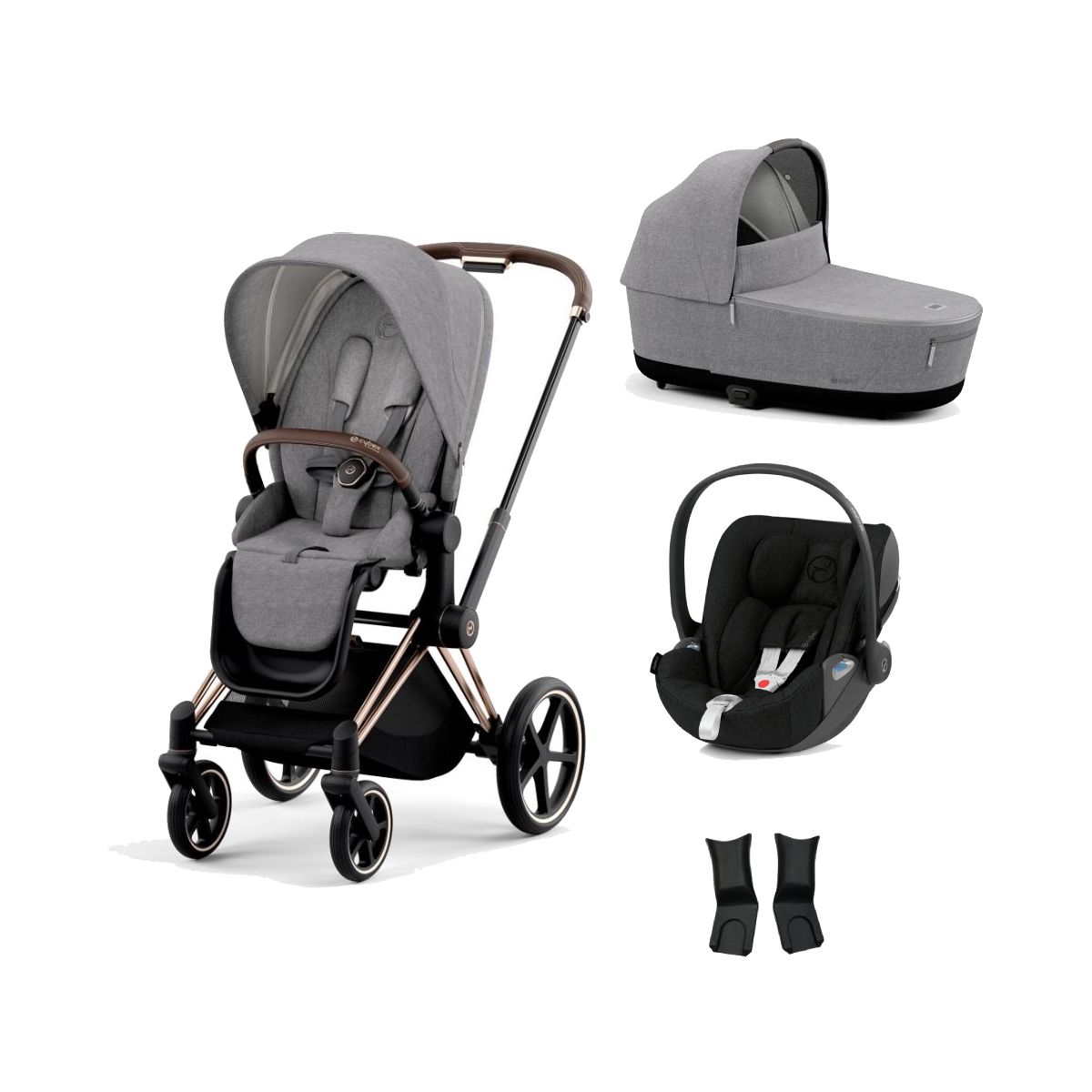 PACKAGE INCLUDES: Cybex Priam Rose Gold Stroller Frame Cybex Priam Seat Pack Cybex Lux Carrycot Cybex Cloud Z i-Size Group 0+ Car Seat Cybex Cloud Z Car Seat Adaptors Cybex Priam Seat Raincover Cybex Lux Carrycot Raincover CYBEX PRIAM PUSHCHAIR The CYBEX PRIAM Pushchair offers a one hand fold, height adjustable handlebar, light frame, bumper bar, all wheel suspension and more. This is a stylish and practical pushchair, it includes features that parents will adore and a smooth and comfy ride for your little one. Whether forward-facing or parent-facing, the PRIAM Lux Seat can be easily adjusted tot he desired position in just a few simple steps. The PRIAM is easy to fold using just one hand. Its seat unit folds away with the frame into a compact, flat package. Even as a free-standing unit, the new PRIAM can be discreetly stowed away ? in a restaurant, on public transport and at home. Thanks to its simple handling, the PRIAM Lux Seat adjusts to a comfortable lie-flat position with just one hand ? transforming the stroller into a comfortable, cosy bed when you´re on the go. The PRIAM’s extendable XXL sun canopy provides UPF50+ sun protection and also effectively protects against wind and weather. All wheel suspension: The new all-wheel suspension of the PRIAM ensures a soft, quiet and comfortable ride for parents and child. Features: Use from birth to 17kgs (approx 4 years) Light aluminium frame Flat ergonomic lying position Bumper bar is made from a leather look material – can be opened at either side and rotated Extendable XXL sun canopy with UPF50+ and mesh insert for air circulation Reversible seat unit All wheel suspension One hand folding One hand recline Extra large shopping basket – takes up to 5kg Dimensions: Chassis weight: 12. 6kg Measurements when folded: L950 x W600 x H400mm CYBEX LUX CARRYCOT: The New Generation Priam Lux Carry Cot attachments for the New Generation Priam / e-Priam enable sophisticated and comfortable family travel. The spacious unit boasts