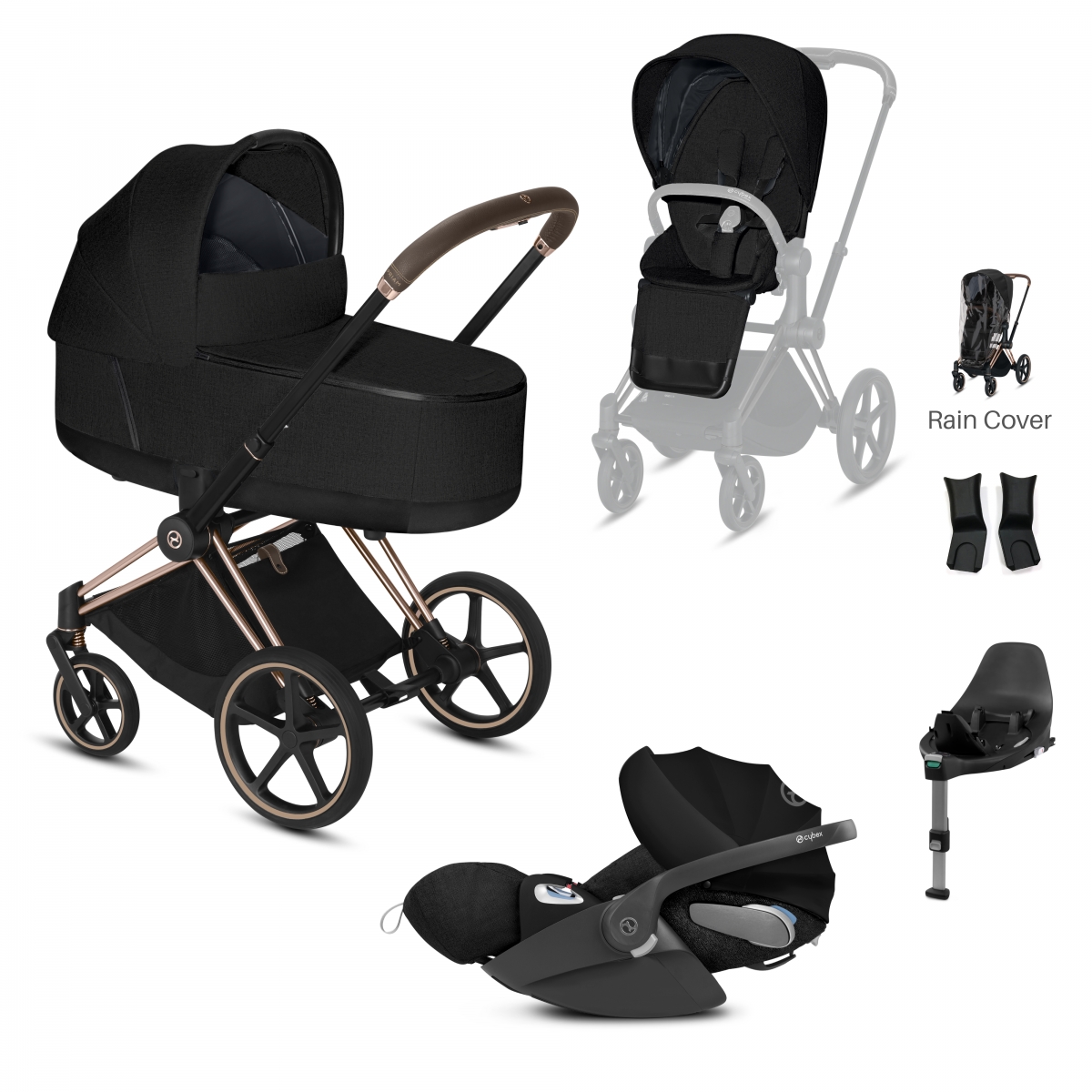 PRODUCT INCLUDES: Cybex Priam Rose Gold Chassis Cybex Priam Seat Unit Cybex Priam Lux Carry Cot Cybex Cloud Z Car Seat Cybex Base Z-Black CYBEX PRIAM ROSE GOLD CHASSIS: The Chrome Priam Chassis with All Terrain is a fantastic pushchair chassis, it includes features that parents will adore and a smooth ride for your little one. Features: Foot brake which is easy to use XL and extendable shopping basket Universal adaptor (for priam attachments incl seats) Light Aluminium frame which is light yet stable Wheels are never flat thanks to the foam filling Height adjustable handlebar – made from high quality leather-like material Rotatable seat unit ? choose from forward or backwards facing with the Lux or 2-in-1 seat One-hand fold mechanism ? fold with one hand and can be stored in small places Compatible travel system ? add the Cybex Cloud Z or Aton car seat onto the Priam Chassis by using the car seat adaptors (which come with the Lux Seat, 2-in-1 Seat and Carrycot) Dimensions: Weight: 8. 1kg CYBEX PRIAM SEAT UNIT: The Cybex Priam 2 in 1 seat unit will attach to any of the Cybex Priam pushchair chassis (sold separately) in either a rear-facing position so younger babies can see mum and dad and interact, or turned to a forward facing position so older children can look out and see the world around them. The Cybex Priam 2 in 1 seat is easy to convert in to a carrycot mode making it suitable from birth and is fully reclinable using just one hand. Newborns and very young babies can travel in the recommended lie flat position, whilst older babies from 6 months and up can use the seat unit and sit upright to take in the view, or recline slightly back so they can enjoy a nap. The seat unit is placed on the chassis in a higher position meaning it is the correct height to use as a highchair when visiting cafes and restaurants. Features: Suitable from birth in carrycot mode, and 6 month to 17kg (approx. 4 years) when used as a seat Rotatable seat unit: Can be attached to face forwa