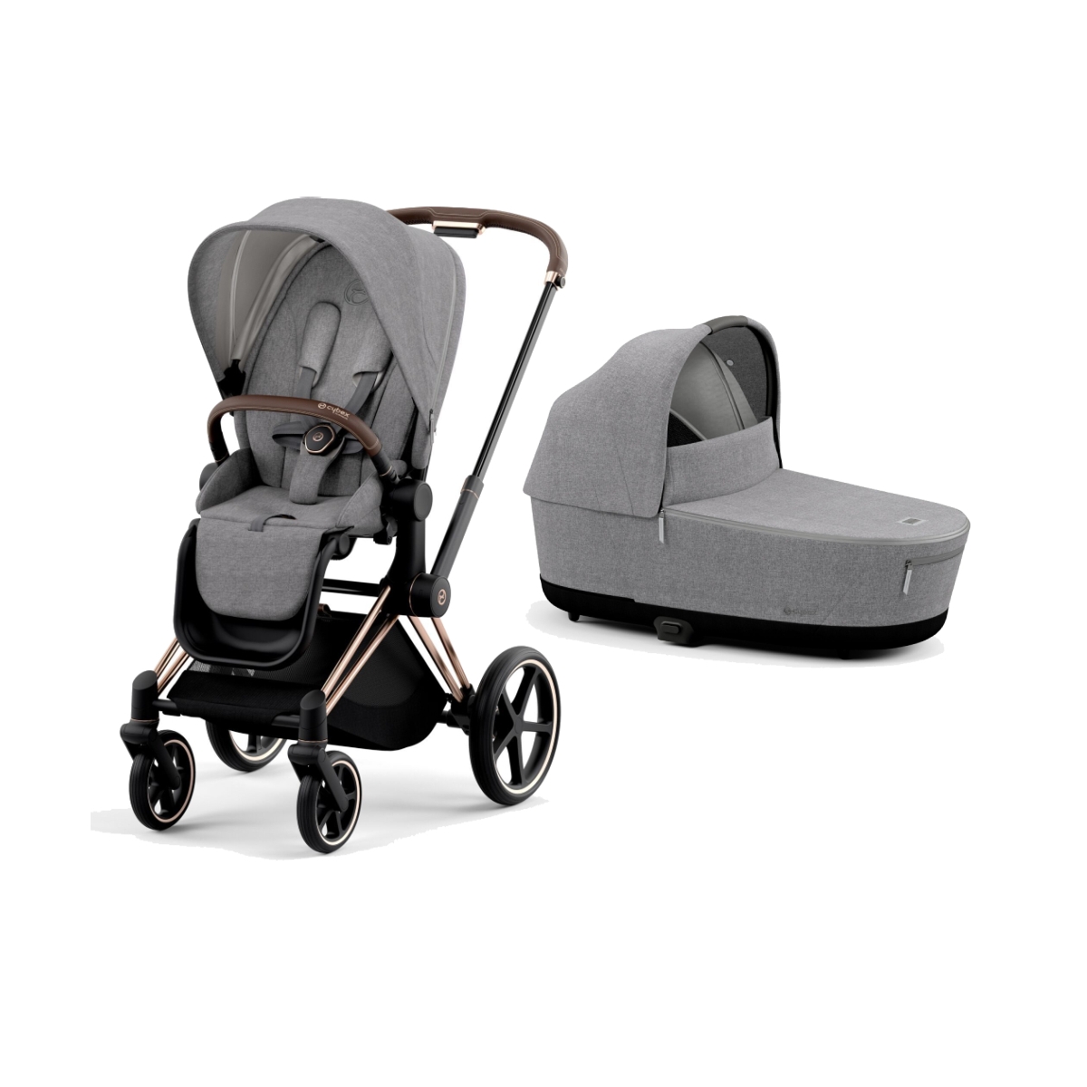 Package Includes: Cybex Priam Rose Gold Stroller Frame Cybex Priam Seat Pack Cybex Lux Carrycot Cybex Lux Carrycot Raincover Cybex Priam Seat Raincover Cybex Priam Pushchair The CYBEX PRIAM Pushchair offers a one hand fold, height adjustable handlebar, light frame, bumper bar, all wheel suspension and more. This is a stylish and practical pushchair, it includes features that parents will adore and a smooth and comfy ride for your little one. Whether forward-facing or parent-facing, the PRIAM Lux Seat can be easily adjusted tot he desired position in just a few simple steps. The PRIAM is easy to fold using just one hand. Its seat unit folds away with the frame into a compact, flat package. Even as a free-standing unit, the new PRIAM can be discreetly stowed away ? in a restaurant, on public transport and at home. Thanks to its simple handling, the PRIAM Lux Seat adjusts to a comfortable lie-flat position with just one hand ? transforming the stroller into a comfortable, cosy bed when you´re on the go. The PRIAM’s extendable XXL sun canopy provides UPF50+ sun protection and also effectively protects against wind and weather. All wheel suspension: The new all-wheel suspension of the PRIAM ensures a soft, quiet and comfortable ride for parents and child. Features: Use from birth to 17kgs (approx 4 years) Light aluminium frame Flat ergonomic lying position Bumper bar is made from a leather look material – can be opened at either side and rotated Extendable XXL sun canopy with UPF50+ and mesh insert for air circulation Reversible seat unit All wheel suspension One hand folding One hand recline Extra large shopping basket – takes up to 5kg Dimensions: Chassis weight: 12. 6kg Measurements when folded: L950 x W600 x H400mm Cybex Lux Carrycot: The New Generation Priam Lux Carry Cot attachments for the New Generation Priam / e-Priam enable sophisticated and comfortable family travel. The spacious unit boasts generous dimensions and maximum comfort. Features: From birth up to 9