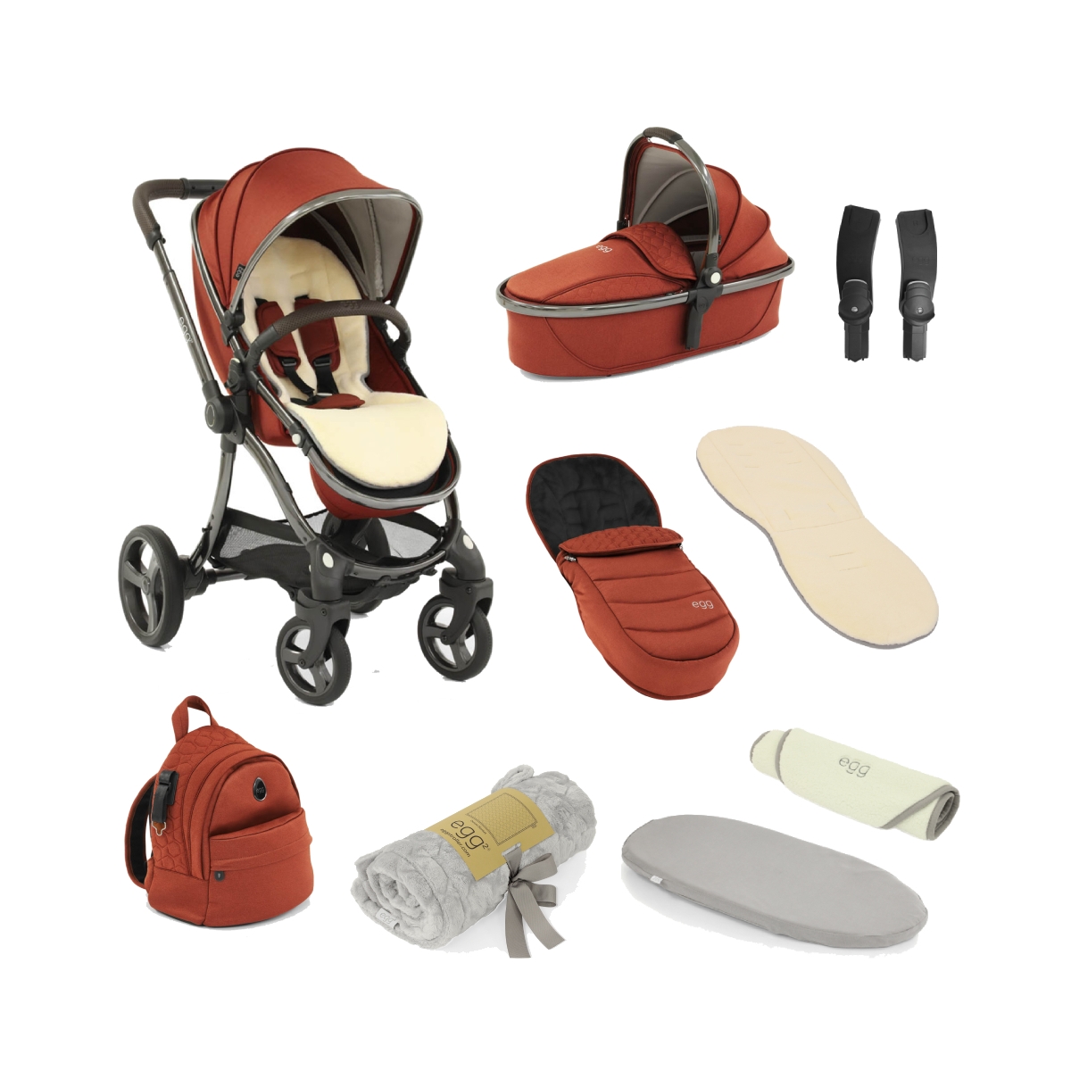 THIS PACKAGE INCLUDES: egg® 2 Stroller egg® 2 Carrycot egg® Multi Car Seat Adapters egg® Backpack egg® Carrycot Sherpa Mattress Topper egg® 2 Deluxe Blanket egg® Seat Liner egg® 2 Footmuff egg® 2 Stroller Introducing the Egg2 Stroller ? re-invented and reborn, Egg have taken the amazing and popular original stroller and evolved it ? they?ve kept all the concepts from the original stroller, including the inspired luxury design and improved on it. Soft-touch marl tailoring in the stunning Just Black colourway, smooth curves, infinite lines, and superb design engineering, the Egg2 ensures an effortlessly smooth ride for baby and exceptional ease of use for new parents. Compatible and convertible, the Egg2 can be used from birth with a carrycot, newborn insert or a variety of car seats like Maxi-Cosi, Cybex or Be Safe as well as the Egg Shell 2 i-Size car seat. A number of coordinating accessories are available including footmuffs, changing bags, and a parasol. Using the Egg2 tandem adaptors you can turn the stroller into a tandem making the stroller future proof if your family grows. FEATURES: Suitable from 6 months to 25kg (Birth with carrycot, newborn insert or car seat) Forward and parent facing Car seat and carrycot compatible One-hand fold Luxurious design that will turn heads Free-standing compact fold to keep fabrics cleaner Adjustable leg rest to keep your child comfy Can be faced towards you or the world, your choice Reclines to keep your child comfortable for longer Dimensions: Open dimensions: 113 x 59 x 84. 5-96cm Folded dimensions: 71 x 32 x 59 cm Seat unit Weight: 5. 25kg egg® 2 Carrycot The egg® Carry Cot is designed with your childs comfort in mind and with a mattress and padded liner included, paired with the domed top of the carrycot your child will be sure to travel in maximum comfort every time they are in their stroller. The egg® Carry Cot is suitable for use in both single and tandem mode, and can even be used for occasional over night sleeping. FEAT