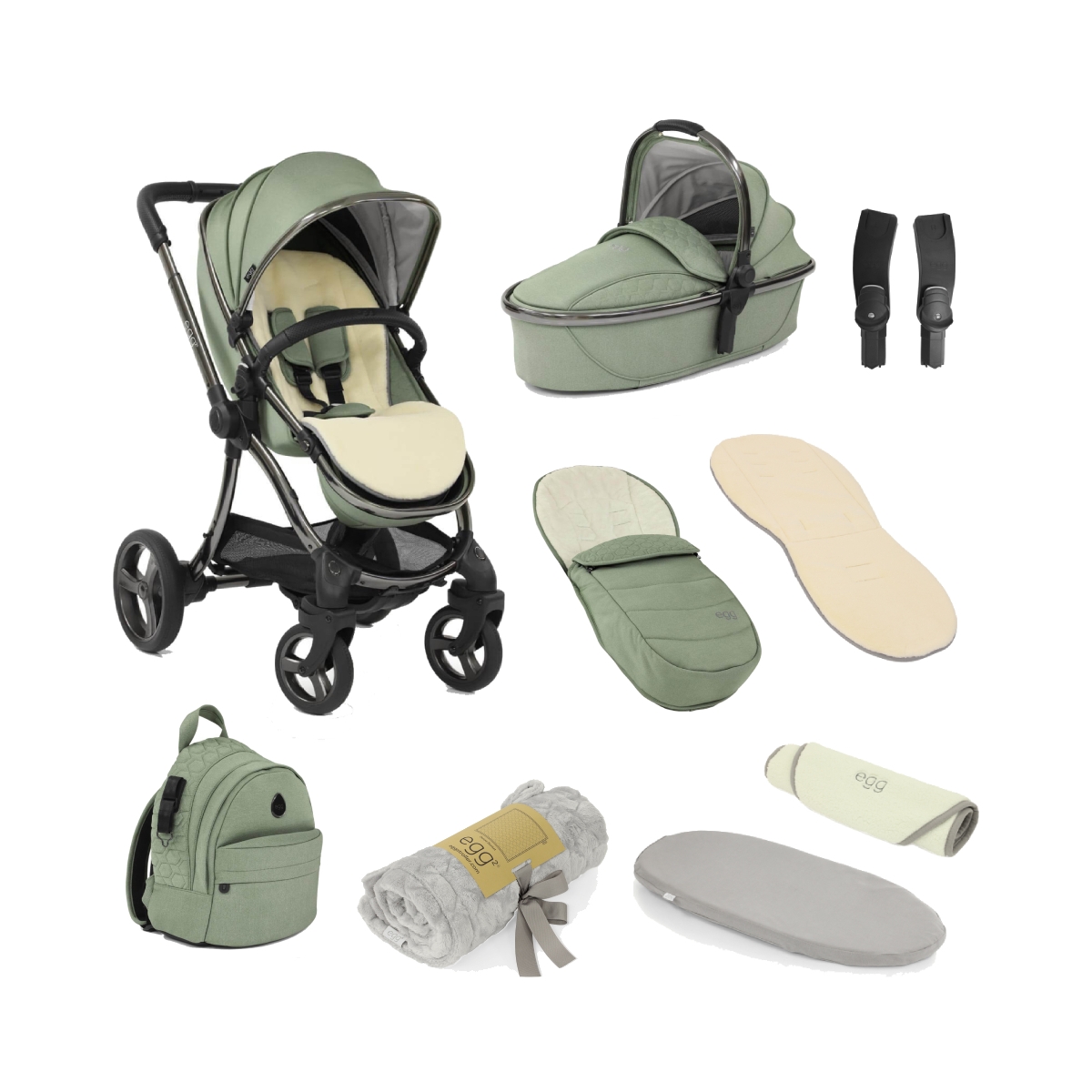 THIS PACKAGE INCLUDES: egg® 2 Stroller egg® 2 Carrycot egg® Multi Car Seat Adapters egg® Backpack egg® Carrycot Sherpa Mattress Topper egg® 2 Deluxe Blanket egg® Seat Liner egg® 2 Footmuff egg® 2 Stroller Introducing the Egg2 Stroller ? re-invented and reborn, Egg have taken the amazing and popular original stroller and evolved it ? they?ve kept all the concepts from the original stroller, including the inspired luxury design and improved on it. Soft-touch marl tailoring in the stunning Just Black colourway, smooth curves, infinite lines, and superb design engineering, the Egg2 ensures an effortlessly smooth ride for baby and exceptional ease of use for new parents. Compatible and convertible, the Egg2 can be used from birth with a carrycot, newborn insert or a variety of car seats like Maxi-Cosi, Cybex or Be Safe as well as the Egg Shell 2 i-Size car seat. A number of coordinating accessories are available including footmuffs, changing bags, and a parasol. Using the Egg2 tandem adaptors you can turn the stroller into a tandem making the stroller future proof if your family grows. FEATURES: Suitable from 6 months to 25kg (Birth with carrycot, newborn insert or car seat) Forward and parent facing Car seat and carrycot compatible One-hand fold Luxurious design that will turn heads Free-standing compact fold to keep fabrics cleaner Adjustable leg rest to keep your child comfy Can be faced towards you or the world, your choice Reclines to keep your child comfortable for longer Dimensions: Open dimensions: 113 x 59 x 84. 5-96cm Folded dimensions: 71 x 32 x 59 cm Seat unit Weight: 5. 25kg egg® 2 Carrycot The egg® Carry Cot is designed with your childs comfort in mind and with a mattress and padded liner included, paired with the domed top of the carrycot your child will be sure to travel in maximum comfort every time they are in their stroller. The egg® Carry Cot is suitable for use in both single and tandem mode, and can even be used for occasional over night sleeping. FEAT