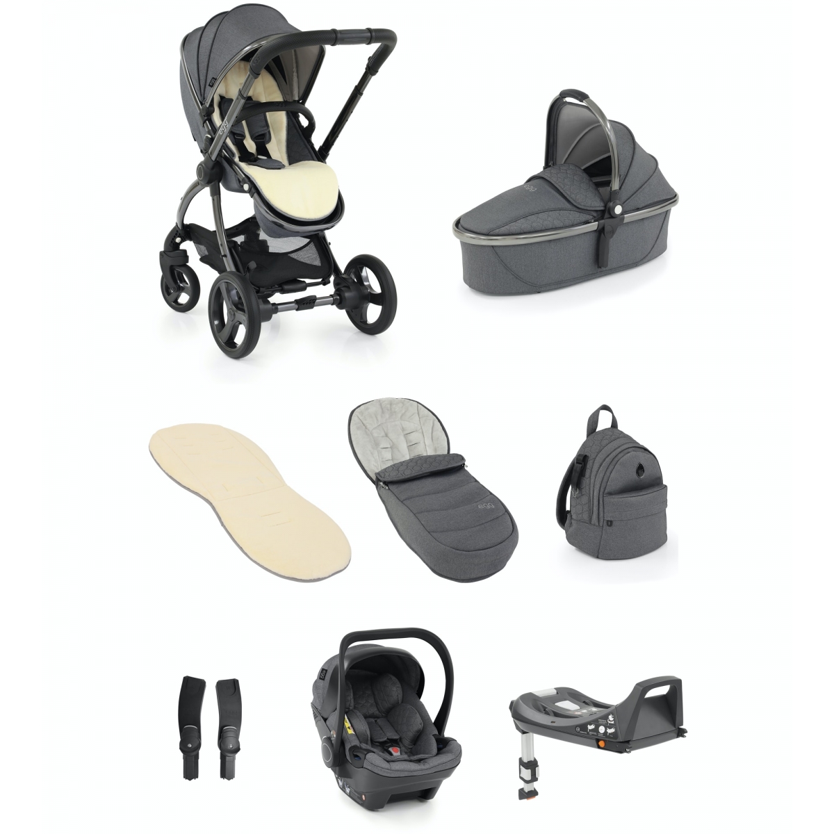 This package includes: egg® 2 Stroller egg® 2 Carrycot egg® 2 Shell Car Seat egg® Shell ISOFIX Base egg® Multi Car Seat Adapters egg® Backpack egg 2 Stroller Introducing the Egg2 Stroller ? re-invented and reborn, Egg have taken the amazing and popular original stroller and evolved it ? they?ve kept all the concepts from the original stroller, including the inspired luxury design and improved on it. Soft-touch marl tailoring in the stunning Just Black colourway, smooth curves, infinite lines, and superb design engineering, the Egg2 ensures an effortlessly smooth ride for baby and exceptional ease of use for new parents. This stroller is a Special Edition and therefore includes a Special Edition matching backpack changing bag as well as a soft fur liner in a beautiful blush colour. Compatible and convertible, the Egg2 can be used from birth with a carrycot, newborn insert or a variety of car seats like Maxi-Cosi, Cybex or Be Safe as well as the Egg Shell 2 i-Size car seat. A number of coordinating accessories are available including footmuffs, changing bags, and a parasol. Using the Egg2 tandem adaptors (sold separately) you can turn the stroller into a tandem making the stroller future proof if your family grows. Features: Suitable from 6 months to 25kg (Birth with carrycot, newborn insert or car seat) Forward and parent facing Car seat and carrycot compatible One-hand fold Luxurious design that will turn heads Free-standing compact fold to keep fabrics cleaner Adjustable leg rest to keep your child comfy Can be faced towards you or the world, your choice Reclines to keep your child comfortable for longer egg 2 Carrycot The egg® Carry Cot is designed with your childs comfort in mind and with a mattress and padded liner included, paired with the domed top of the carrycot your child will be sure to travel in maximum comfort every time they are in their stroller. The egg® Carry Cot is suitable for use in both single and tandem mode, and can even be used for occasional o