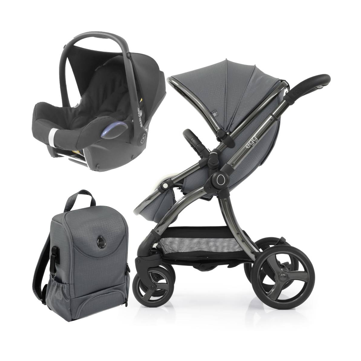 PACKAGE INCLUDES: egg® 2 Stroller egg® Maxi Cosi Cabriofix Car Seat egg® Multi Car Seat Adapters egg® 2 Seat Liner egg®2 Backpack EGG® 2 STROLLER: Introducing the Egg2 Stroller ? re-invented and reborn, Egg have taken the amazing and popular original stroller and evolved it ? they?ve kept all the concepts from the original stroller, including the inspired luxury design and improved on it. Soft-touch marl tailoring in the stunning colourways, smooth curves, infinite lines, and superb design engineering, the Egg2 ensures an effortlessly smooth ride for baby and exceptional ease of use for new parents. Compatible and convertible, the Egg2 can be used from birth with a carrycot, newborn insert or a variety of car seats like Maxi-Cosi, Cybex or Be Safe as well as the Egg Shell 2 i-Size car seat. A number of coordinating accessories are available including footmuffs, changing bags, and a parasol. Using the Egg2 tandem adaptors (sold separately) you can turn the stroller into a tandem making the stroller future proof if your family grows. Features: Suitable from 6 months to 25kg (Birth with carrycot, newborn insert or car seat) Forward and parent facing Car seat and carrycot compatible One-hand fold Luxurious design that will turn heads Free-standing compact fold to keep fabrics cleaner Adjustable leg rest to keep your child comfy Can be faced towards you or the world, your choice Reclines to keep your child comfortable for longer MAXI COSI CABRIOFIX GROUP 0+ CAR SEAT: The lightweight Maxi-Cosi Cabrio Fix infant carrier is suitable from birth to 13 kg and is compatible with Maxi-Cosi and Quinny pushchairs to form a stylish travel system. This car seat features enhanced Side Protection System and a soft padded seat with newborn seat reducer. Practical belt hooks help to keep the harness out of the way when placing your child in the seat. A one-pull harness adjustment ensures its correct tension. As your baby grows the harness and headhugger can be altered to ensure that it is
