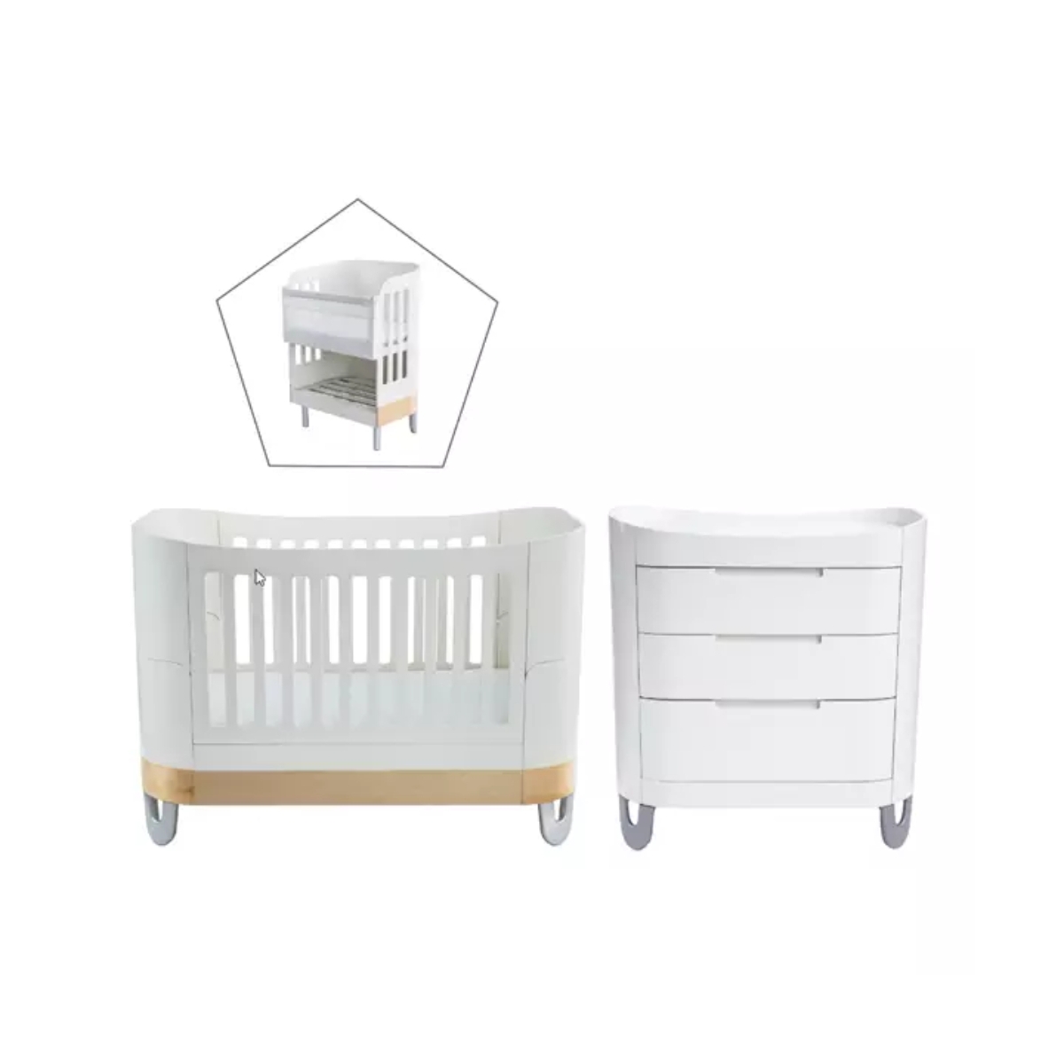 Including a convertible bedside crib and matching changing unit; the Gaia Baby Serena Complete Sleep Cot Bed + Co-Sleep Nursery Set has it all! Suitable from birth to 5 years and designed to be adapted to suit your babies development, simply convert the frame when they’ve outgrown each stage. All made from responsibly sourced materials and featuring 6 height settings, the co-sleeper crib can even be paired with lower frame beds and divans! Including a mesh side panel, keep an eye on your baby while they stir and reassure them without the need to get up! There is even a handy storage shelf for those essentials! And with slatted sides, base and a breathable comfort plus mattress included, Gaia Baby have ensured maximum ventilation for a safe and comfortable sleeping environment. Simply transform the bedside crib to a full sized cot bed and then to toddler bed with and without rails and make each transition easier on your tot. And later add the optional junior extension kit so your little one can continue using the bed frame up to the age of 10. Including a matching changing unit with changing pad and 3 full sized storage drawers, nappy changes are made hassle-free! Stylish, practical and made with love, Gaia Baby is the perfect choice for your family. Features: Contemporary convertible bedside crib and cot bed with matching dresser Available in a choice of colours Space saving – use as a compact bedside crib from birth to 6 months, then convert to a full sized cot bed Straps provided to safely secure the bedside crib to your bed Can be used as a bedside crib and standalone crib Co-sleep crib has 6 height settings to suit adult beds from 40-70cm The co-sleeper breathable comfort plus mattress with washable cover comes included – cot bed mattress available separately Design grows with your child – simply convert to suit your needs Transforms from bedside crib to cot bed, to toddler bed with rails and then a toddler bed Cot bed suitable from birth to 5 years Contoured er