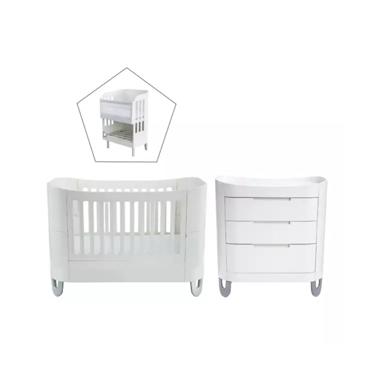 Including a convertible bedside crib and matching changing unit; the Gaia Baby Serena Complete Sleep Cot Bed + Co-Sleep Nursery Set has it all! Suitable from birth to 5 years and designed to be adapted to suit your babies development, simply convert the frame when they’ve outgrown each stage. All made from responsibly sourced materials and featuring 6 height settings, the co-sleeper crib can even be paired with lower frame beds and divans! Including a mesh side panel, keep an eye on your baby while they stir and reassure them without the need to get up! There is even a handy storage shelf for those essentials! And with slatted sides, base and a breathable comfort plus mattress included, Gaia Baby have ensured maximum ventilation for a safe and comfortable sleeping environment. Simply transform the bedside crib to a full sized cot bed and then to toddler bed with and without rails and make each transition easier on your tot. And later add the optional junior extension kit so your little one can continue using the bed frame up to the age of 10. Including a matching changing unit with changing pad and 3 full sized storage drawers, nappy changes are made hassle-free! Stylish, practical and made with love, Gaia Baby is the perfect choice for your family. Features: Contemporary convertible bedside crib and cot bed with matching dresser Available in a choice of colours Space saving – use as a compact bedside crib from birth to 6 months, then convert to a full sized cot bed Straps provided to safely secure the bedside crib to your bed Can be used as a bedside crib and standalone crib Co-sleep crib has 6 height settings to suit adult beds from 40-70cm The co-sleeper breathable comfort plus mattress with washable cover comes included – cot bed mattress available separately Design grows with your child – simply convert to suit your needs Transforms from bedside crib to cot bed, to toddler bed with rails and then a toddler bed Cot bed suitable from birth to 5 years Contoured er