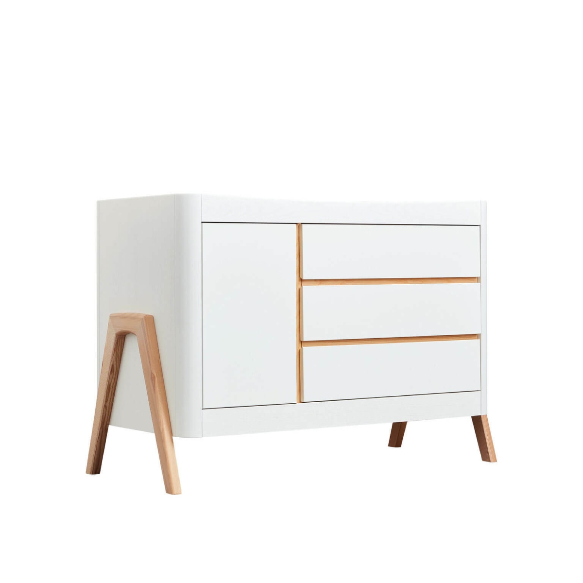 The Hera Dresser is a beautiful Scandi inspired and cleverly designed choice for your family. Made from sustainably managed Ash forests, the gently curved ends in White tones highlight the real grain of this eco-friendly wood. With stunning Natural Ash A-frame accents, its’ generous 1206×606 cm size makes it suitable for storing all your baby’s needs and for use later on in a teen or adult space. 3 generous smooth action drawers and a cabinet with 2 height adjustable shelves, provide ample storage space for clothing, changing essentails and bedding. The dresser top has a safety lip to prevent items rolling off and can safely be used to locate a cot top changer. Features: Stylish contrasting Scandinavian design Made of solid ash wood Generous storage space Easy open cabinet with 2 shelves Three soft close drawers A Frame legs in real wood texture Top Changing Station available separately Dimensions: Dimensions (H x W x L): 92 x 60. 6 x 124. 4 cm Weight: 42kg