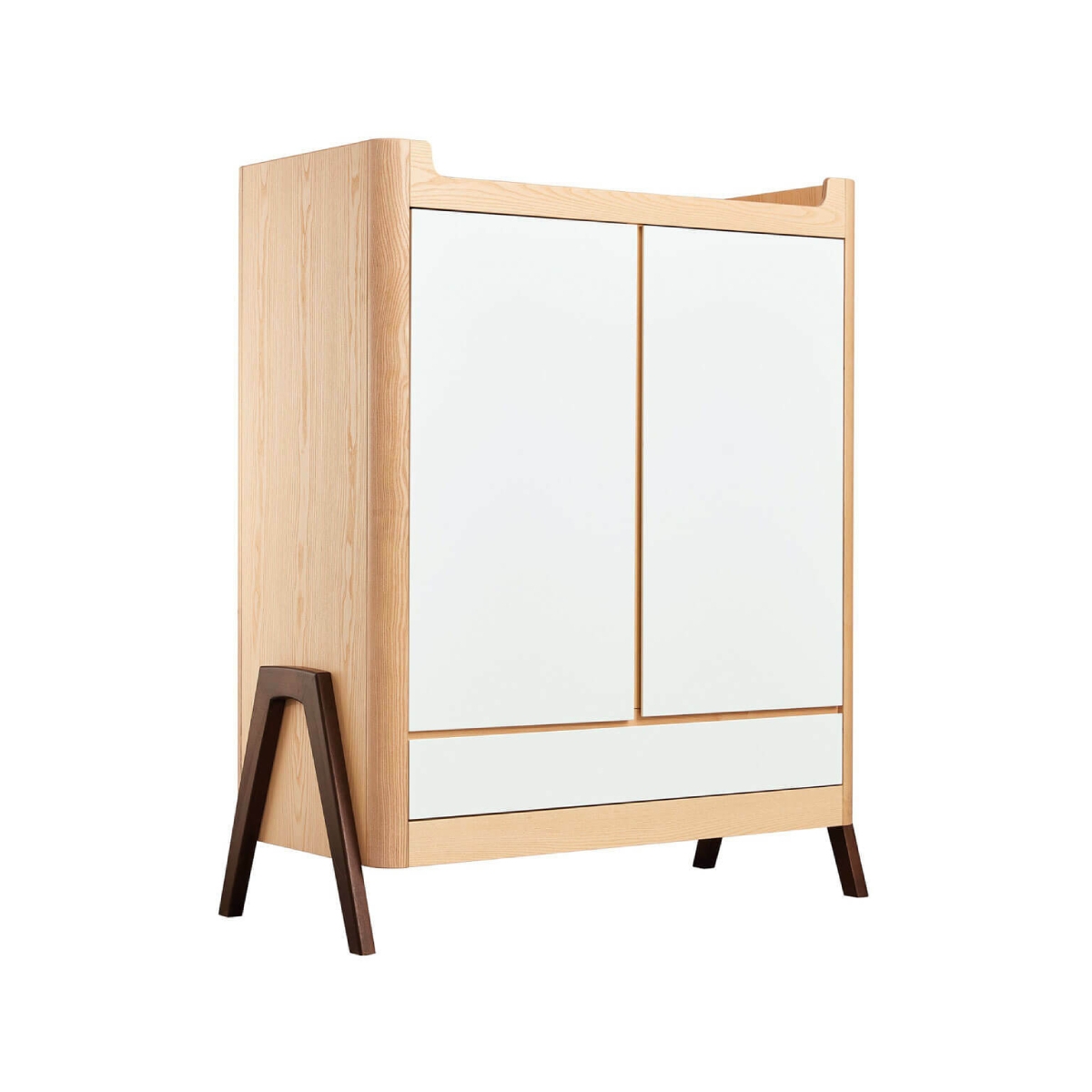 The Hera Wardrobe is a stunning Mid-Century inspired design, equally at home in the nursery or any bedroom in your home. Made from sustainably managed Ash forests, the gently curved ends in Natural Ash tones highlight the real grain of this eco-friendly wood. With stunning Walnut A-frame accents, its’ generous 1294×644 cm size makes it suitable for storing all your baby’s needs and for use later on in a teen or adult room. Double doors open to reveal hanging rails on one or both sides (2 x metal hanging rails included). The wooden shelves can be located on both sides (4 shelves included) and height adjusted to suit your needs and as your child grows. Underneath, a smooth action drawer provides ample storage space for bullky clothing or bedding. The Hera wardrobe is deep enough to hang adult sized clothing. Features: Stylish contrasting Scandinavian design Made of solid ash wood Spacious two door storage area Four adjustable shelves Two removable hanging rains Full width soft close drawer A Frame legs in real wood texture Dimensions: Dimensions (H x W x L): 160 x 64. 4 x 129. 4 cm Weight: 73kg