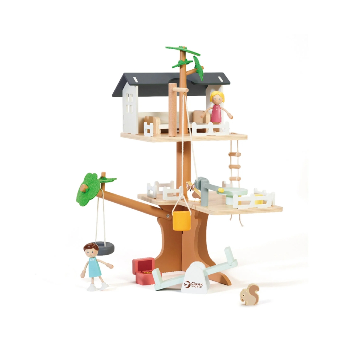 This beautifully designed wooden tree house has so many ways for your little one to play with it! It has 2 human figurines, 2 animals and great accessories including a swing, bucket on a pulley, seesaw, bed, treasure chest and chairs. This tree house can help provide hours of imaginative play and can help encourage fine motor skill development. Young children will love the endless possibilities to immerse themselves in this mini world. Features: Suitable for 3 years + A wooden tree house with wooden figurines to explore with Two floors of tree house to enjoy, joined by ladders and pulleys 31 pieces included Dimensions: Dimensions: 40. 0cm x 35. 0cm x 50. 0 cm