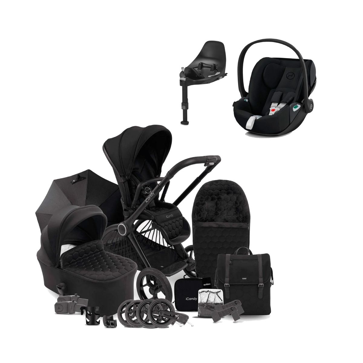 PACKAGE INCLUDES: iCandy Core Chassis with integrated Ride-On Board iCandy Core Hub Light x2 iCandy Core Hub Light charger and key iCandy Core Carrycot iCandy Core Seat unit Cybex Cloud Z2 i-Size Group 0+ Car Seat Cybex Z2 Base iCandy Core Rural wheel set iCandy Core Urban wheel set iCandy Core Wheel bag iCandy Core Raincover x2 iCandy Core Elevator Adaptors Car Seat Adaptors iCandy Core Rucksack iCandy Core Footmuff & Liner iCandy Core Parasol iCandy The Screen iCandy Cup Holder iCandy Clamp ICANDY CORE 2IN1 PRAM SYSTEM The iCandy Core is yet again a truly ground-breaking new pushchair designed by the iconic British company. The Core has been expertly designed for every journey; a multi-mode pushchair, adaptable for every age and stage of a child?s development. You?ll only ever need one pushchair. The exquisite new design showcases striking styling, luxuriously developed fabric and cutting-edge features such as the Multi-Mode Wheelbase and pioneering LED Visibility Hub Light. The iCandy Core prioritises comfort for baby and ease of use, all whilst providing the multi-use functionality and longevity demanded by modern family life. Designed for every journey, the iCandy Core is an adaptable pushchair for any terrain. Striking new design, multi-mode wheelbase, new LED Visibility Hub light feature and the largest seat unit in the iCandy range. The bundle includes Pushchair, Carrycot, Seat Unit, LED Visibility Hub Light, Footmuff & Liner and additional complimenting accessories. Features: New distinctive styling with luxury knitted jersey fabrics Suitable from birth (with carrycot) up to 25kg (15kg on elevator adaptors) LED Visibility Hub Light Integrated Ride-on Board Multi-mode wheelbase Super soft, luxury fleece-lined carrycot suitable for permanent overnight sleeping Pop-up calf rest Adjustable, multi-function SPF 50+ canopy with multi-position large viewing window with mesh ventilation Parent and world-facing modes Adjustable handlebar heights Extra spacious ?fan?