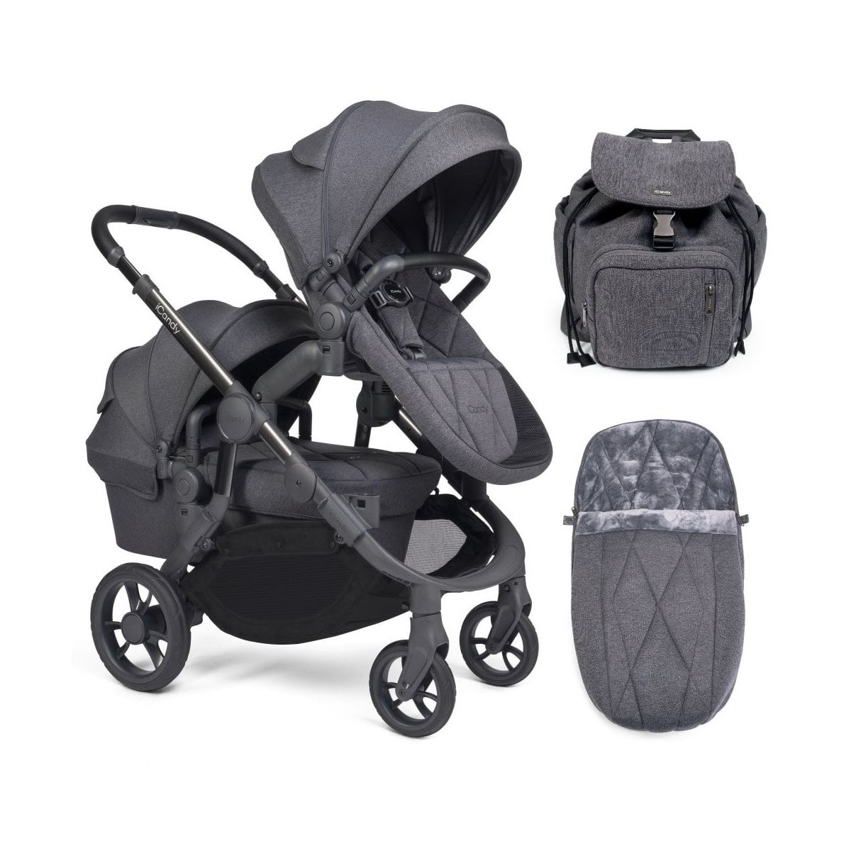 This Package Includes: Chassis Carrycot Seat Unit 2x Canopy Matching Duo Pod Matching Changing Bag 1x Apron Converter Base Second Seat Fabric Rain Cover to fit both Seat Unit and Carrycot Elevators Car seat adaptors The iCandy Orange is the ultimate companion when it comes to parenthood and the beautiful, multi-functional pushchair is ready for the adventure, every step of the way. Enabling parents to transport two children simultaneously on a single footprint, the iCandy Orange Double Pushchair is the perfect option for families with a baby and a toddler. The freedom to transport two children simultaneously does not compromise the single footprint or sophistication of the pushchair, meaning its perfect for nipping in and out of shops or through doorways. The double bundle is complete with chassis, carrycot, two seat units and car seat adaptors. The tandem set up means your toddler can ride in comfort in the seat unit whilst baby can use the carrycot, which is also suitable for permanent overnight sleeping. Once baby outgrows the carrycot, the fabrics can be stripped away from the carrycot frame using an innovative ?zip in, zip out? design, transforming the carrycot into the seat unit. An ingenious integrated Ride-on Board, lightweight and streamlined chassis, super spacious basket, as well as a changing bag and Duo Pod included, mean the iCandy Orange is ready from the get-go, making it the ultimate choice for busy families with a toddler and a baby. Functionality modifications, including softer suspension and the ability to fold the pushchair with the seat unit and bumper bar still attached, enhance day to day life as well as comfort for both parent and children. These adaptations don?t come at the expense of style, with the iCandy Orange exuding a sophisticated and refined aesthetic, achieved through modern colour blocking of premium padded fabrics, available in a range of stylish shades. Features: Suitable from birth (with carrycot) up to 25kg Carrycot suitable