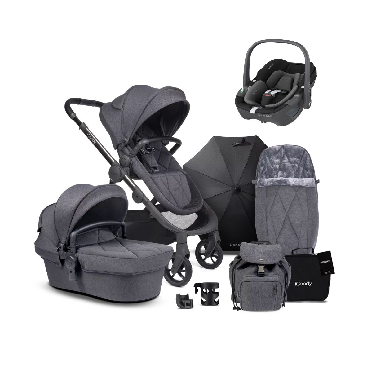 PACKAGE INCLUDES: iCandy Orange Puschair iCandy Orange Carrycot Maxi Cosi Pebble 360 Group 0+ Car Seat iCandy Orange Rain Cover iCandy Orange Changing Bag iCandy Orange Fottmuff iCandy Orange Parasol (To follow in March) iCandy Cup Holder The iCandy Orange is the ultimate companion when it comes to parenthood and the beautiful, multi-functional pushchair is ready for the adventure, every step of the way. An ingenious integrated Ride-on Board, lightweight and streamlined chassis, super spacious basket, as well as a changing bag and Duo Pod included, mean the iCandy Orange is ready from the get-go, making it the ultimate choice for first-time parents. Functionality modifications, including softer suspension and the ability to fold the pushchair with the seat unit and bumper bar still attached, enhance day to day life as well as comfort for both parent and child. These adaptations don?t come at the expense of style, with the iCandy Orange exuding a sophisticated and refined aesthetic, achieved through modern colour blocking of premium padded fabrics, available in a range of stylish shades. The added peace of mind that the iCandy Orange can scale into a double pushchair future proofs the design for parents, making it the ultimate choice for growing families. Features: Suitable from birth (with carrycot) up to 25kg Carrycot suitable for permanent overnight sleeping Converts from a single to double pushchair Converts to full travel system with included car seat adaptors Integrated Ride-on Board Co-ordinating changing bag and Duo Pod included One-handed seat recline with three positions Cinema seating 30 different configurations Freestanding fold Folds with seat unit and bumper bar still attached (single mode) Areas of functionality clearly highlighted in light grey Parent and world facing modes Adjustable, multi-function SPF50+ canopy with multi-position mesh ventilation Soft suspension to make light work of curbs Optimized tyre tread for off-road exploring Adjustable han