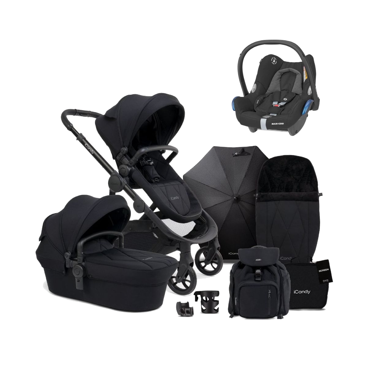 PACKAGE INCLUDES: iCandy Orange Puschair iCandy Orange Carrycot Maxi Cosi Cabrio Fix Car Seat iCandy Orange Rain Cover iCandy Orange Changing Bag iCandy Orange Fottmuff iCandy Orange Parasol (To follow in March) iCandy Cup Holder The iCandy Orange is the ultimate companion when it comes to parenthood and the beautiful, multi-functional pushchair is ready for the adventure, every step of the way. An ingenious integrated Ride-on Board, lightweight and streamlined chassis, super spacious basket, as well as a changing bag and Duo Pod included, mean the iCandy Orange is ready from the get-go, making it the ultimate choice for first-time parents. Functionality modifications, including softer suspension and the ability to fold the pushchair with the seat unit and bumper bar still attached, enhance day to day life as well as comfort for both parent and child. These adaptations don?t come at the expense of style, with the iCandy Orange exuding a sophisticated and refined aesthetic, achieved through modern colour blocking of premium padded fabrics, available in a range of stylish shades. The added peace of mind that the iCandy Orange can scale into a double pushchair future proofs the design for parents, making it the ultimate choice for growing families. FEATURES: Suitable from birth (with carrycot) up to 25kg Carrycot suitable for permanent overnight sleeping Converts from a single to double pushchair Converts to full travel system with included car seat adaptors Integrated Ride-on Board Co-ordinating changing bag and Duo Pod included One-handed seat recline with three positions Cinema seating 30 different configurations Freestanding fold Folds with seat unit and bumper bar still attached (single mode) Areas of functionality clearly highlighted in light grey Parent and world facing modes Adjustable, multi-function SPF50+ canopy with multi-position mesh ventilation Soft suspension to make light work of curbs Optimized tyre tread for off-road exploring Adjustable handlebar hei