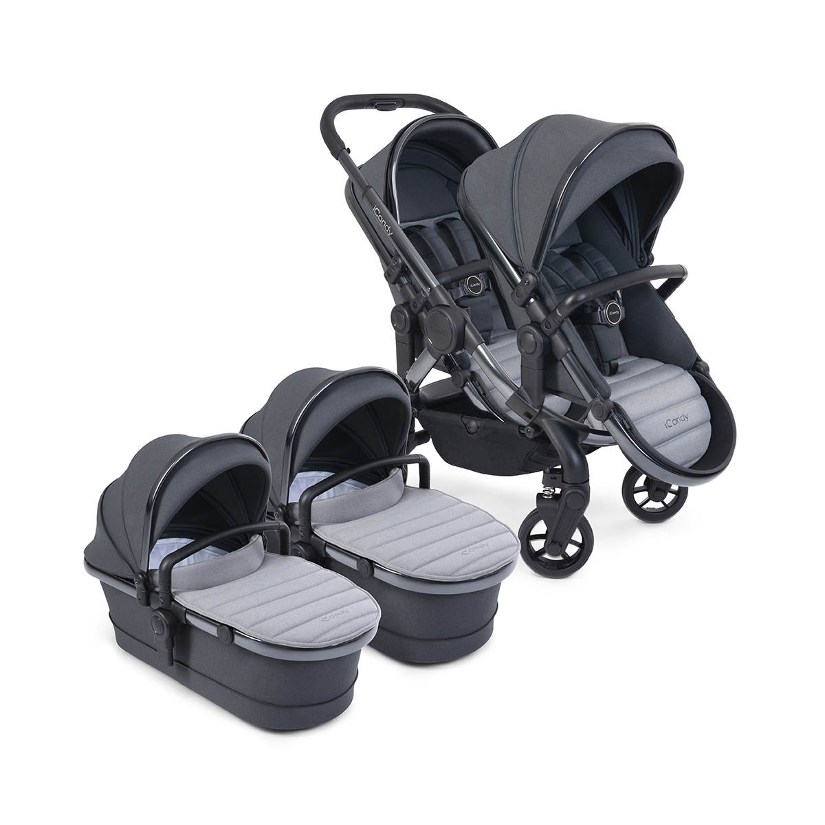 This Package Includes: Peach Chassis with integrated Ride on Board Peach Carrycot Fabric x2 Peach x2 Seat Unit Fabric x2 Peach Carrycot / Seat Unit frame x2 Peach Canopy x2 Peach Mattress Liner x2 Peach Basket Peach Raincover x2 Peach Elevator Peach main and lower car seat adaptors Peach Bumper Bar x2 Peach Converter Adaptors Peach ?Pip-Zip? carry bag Car Seat not included The ultimate pushchair for first time parents, the iCandy Peach is beautifully engineered, suitable from birthdue to the spacious carrycot which can also be used for permanent overnight sleeping. With its soft, modernpremium knitted jersey fabrics guarantee comfort for baby and style for parents. Now in its seventh generation, the iCandy Peach is the choice of parents who demand cutting edge design andstyle that lasts. Famous for its one-handed fold, incorporated carry strap and fashion forward fabrics, the Peach can easily convert into a twin or double pushchair with the use of innovative adaptors. Every element of the Peach has been crafted to ensure perfection in functionality, quality and safety. From thevery first push, with its high-quality aluminium frame, puncture proof PU tyres and new integrated Ride on Board you?ll immediately notice the ultra-smooth ride and effortless manoeuvrability. Features: Suitable from birth (with carrycot) up to 25kg (15kg on elevators) Carrycot with luxury fleece lining, suitable for permanent overnight sleeping Converts from single to double / twin pushchair Converts to full travel system with included car seat adaptors Parent and world facing modes with integrated Ride on Board One-handed seat recline with four positions Adjustable calf rest for ultimate comfort Easy slide ?Pop-Up? harness with adjustable head support Auto chassis fold lock Adjustable, multi-function water repellent and SPF50+ canopy, with multi position large viewing window with mesh ventilation Leatherette handlebar, with matching leatherette swivel bumper bar Handy Pip-Zip carry bag on the b
