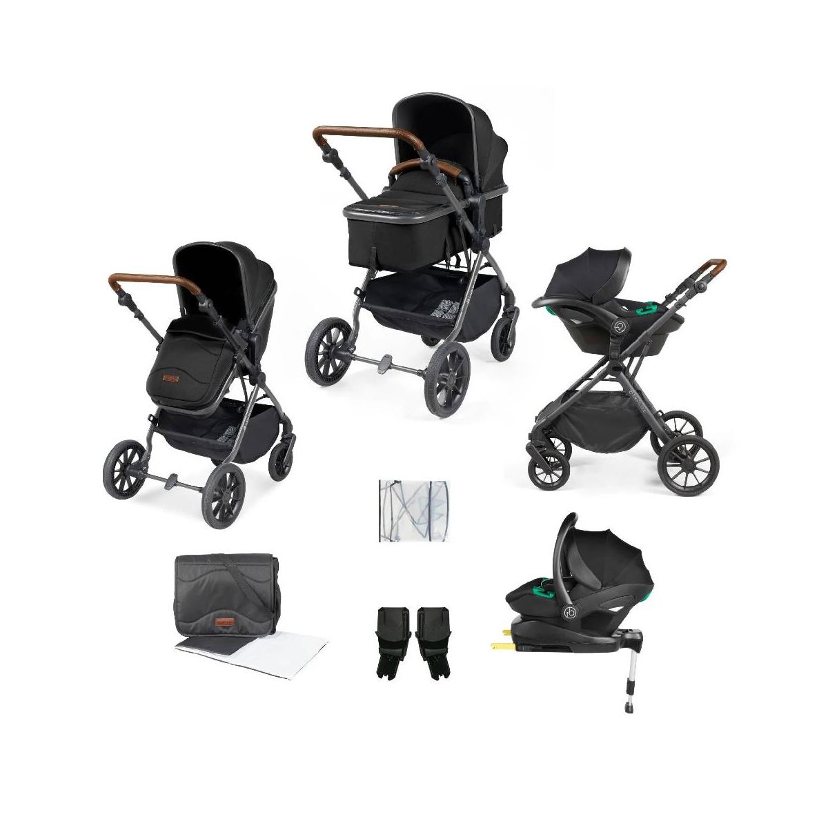 Package Includes: Cosmo pushchair Carrycot Stratus i-Size Car Seat Stratus ISOFIX base Co-ordinating hood, apron, footmuff, carrycot and seat unit Changing bag and mat We all want a travel system that looks good, is up to the task of protecting precious cargo and doesn?t cost the earth. The Cosmo All in One i-Size Travel System with ISOFIX Base from Ickle Bubba ticks every box. Whether you’re hitting the shops or strolling round the park, the Cosmo pushchair brings some sophisticated style without breaking the bank. Bubba and parent can enjoy luxury fabrics, a fleece-lined footmuff and a protective apron with privacy panel. What’s more, you can choose between a modern matte black finish or gunmetal chassis colour to offset the leatherette handlebar and create an affordable pushchair of distinction. But it doesn?t stop there ? Cosmo is packed full of handy extras to bring you more value for money. From the extra-large shopping basket for all those essential purchases to the multi-position seat recline that lets little one relax in comfort. What?s more the quick-release treaded wheels provide robust support on everyday terrain and the lockable swivel front wheels and adjustable handle height provide even more control in busy spaces. The Stratus Car Seat and ISOFIX Base meet the i-Size international safety standard ECE-R129. i-Size ensures child car seats are easier to fit, provide improved protection from side impacts and keep children rear-facing for longer. It also complies with the ISOFIX international standard for car seat installation. This means you can be doubly sure that it will keep your little one secure on all their journeys. With side impact protection, pop-out impact panels and a supportive newborn liner, you can rest assured that baby will be safe going from A to B. Stroller Features: Quick-release treaded wheels Hood features UPF 50+ sun protection Co-ordinating hood, apron, footmuff and pram seat unit Extra-large accessible shopping basket Multi-positi