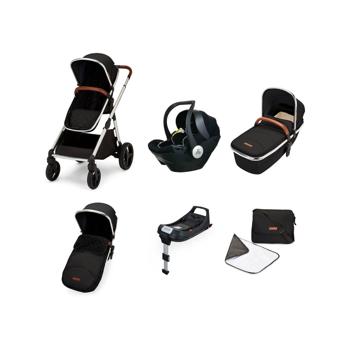 Superior in style and practicality the Eclipse bundle is the ideal pushchair set, featuring a carrycot, pushchair, i-size car seat and Isofix base. This luxury i-size travel system will appeal to those who want to future proof their pushchair, for their next little one or parents with a pre-schooler and a newborn baby on the way. The Bubba Board can accommodate up to a 20kg child standing on the built-in board, whilst your baby is safely snuggled up on the carrycot, pushchair, or car seat. The chrome chassis contrasts beautifully with the leatherette detailing and true to its name, a range of beautifully soft fabrics are available in darkening shades. Transitioning from light to dark, you can choose from Silver Grey, Graphite Grey, Midnight Blue, or Jet Black. In true Ickle Bubba style this bundle comes with a host of accessories including rain cover, colour co-ordinating changing bag and mat, carrycot apron and mattress, footmuff and extendable hood. Includes the Mercury i-size car seat and Isofix base ? the top of the range Mercury i-Size Car Seatis suitable from birth to 80cm tall (approx. 15 months), adheres to R129 ? the latest safety standards, and is easily fitted into your car with the Isofix base supplied. Features: 8 modes straight from the box enabling you to use the system for a single child, or 2 children with the use of the built-in Bubba Board for your toddler Bundle includes Mercury i-size Car Seat fitted using the universal car seat adapters provided, with built-in hood and Isofix base, worth £319 Lightweight chrome chassis with telescopic extendable handle, adjustable to 4 positions to suit your height Premium quality super-soft fabric in a choice of 4 colours, with either soft tan or black leatherette handle and bumper bar Parent-facing carrycot comes with apron and mattress ? suitable for occasional overnight sleeping Interchangeable UPF 50+ extendable hood fits both the carrycot and seat unit, giving protection against harmful rays Reclinable se
