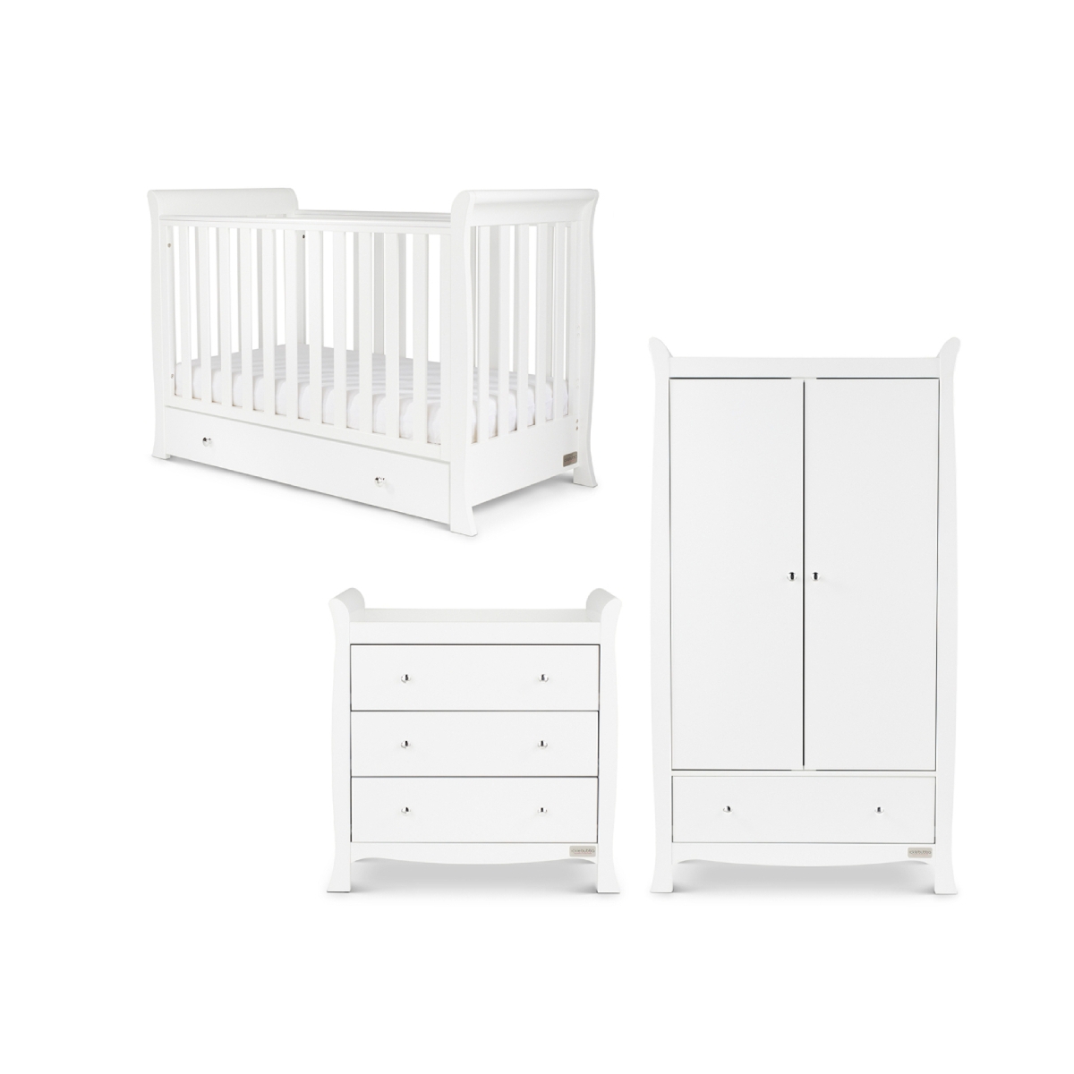 Package Includes: Ickle Bubba Snowdon 4 in 1 Mini Cot Bed Ickle Bubba Snowdon Changing Unit / Chest Ickle Bubba Snowdon Wardrobe Ickle Bubba Snowdon 4 in 1 Mini Cot Bed Suitable from birth to approx. 4 years old, the Ickle Bubba Snowdon Mini 4 in 1 Cot Bed is beautifully crafted cot bed, that will be an excellent choice for small traditional style nursery. Its classic open slatted sides with teething rails are ideal for watching over your sleeping baby and provide protection for delicate teeth. Snowdon Mini 4 in 1 Cot Bed has adjustable mattress base, which can be set on 3 different levels, depending on the development stage of your little one. The top position ensures easy access for the parents and is suitable up to approx. 6 months or until the baby starts pulling up to sit. The middle position provides extra security when your baby is able to sit but can’t stand yet. The lowest position is the best one for denying escapes when your little one can stand and walk. When your child is ready for more independent sleep, you can convert your Snowdon Mini Cot Bed to an elegant toddler bed with rails. To do that you just need to remove one high rail and replace it with specially shaped toddler rails included. This solution will allow your baby to get in and out independently, yet ensue protection from falling out at night. When your child is ready for a next step both sides could be removed too. The Snowdon Mini Cot Bed can be also transformed to a stylish long lasting day bed with one high rail used as a backrest . The Snowdon 4 in 1 Mini Cot Bed requires one and the same 120 x 60 cm mattress (available separately) for all modes. This practical cot bed includes matching under drawer with handles and easy going runners, that provides super convenient storage perfect for bedding and other essentials. Features: Suitable from birth to approx. 4 years old Elegant traditional sleight-shaped design Classic open slatted sides with teething rails Easily converts from cot to todd