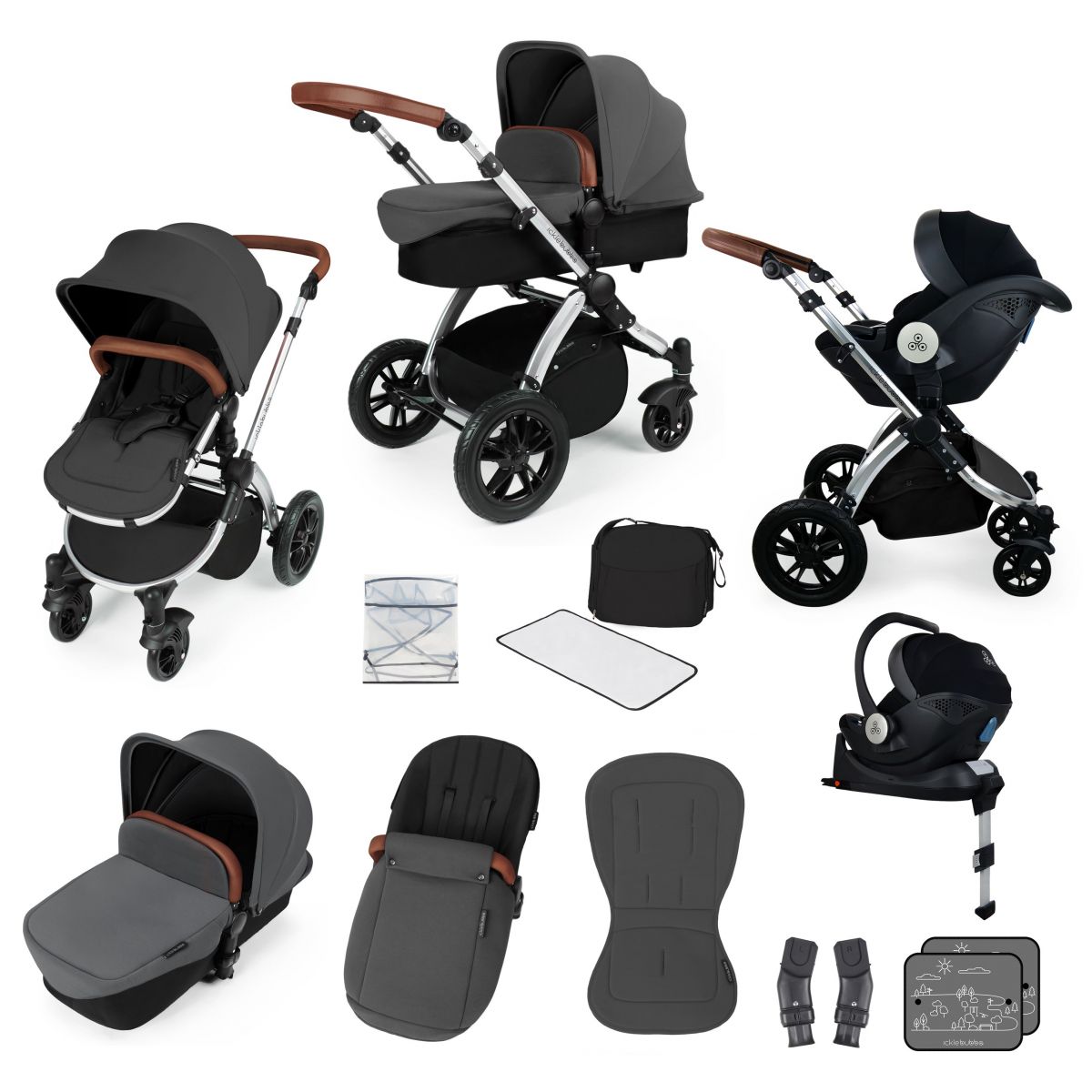 PACKAGE INCLUDES: Ickle Bubba Stomp V3 Chassis Ickle Bubba Seat Unit/Carrycot Fabric Pack Ickle Bubba I-SIZE Mercury Car Seat Ickle Bubba I-SIZE Mercury ISOFIX BASE Ickle Bubba Car Seat Adapters The Stomp V3 i-Size all in one travel system has everything you?ll need from infant to toddler, adapting easily from carrycot to use from birth to 6 months, to pushchair from 6 months to 22kgs (approx. 4 years old) and the Mercury i-Size car seat with Isofix Base to take you and your baby wherever you want to explore. This one stop bundle has a choice of chassis colour, fabric colours, multiple accessories and an Isofix compatible Mercury i-Size car seat that attaches to the same pram chassis and is the only purchase you?ll need to take your baby around in style and comfort. This package includes an Isofix base. Designed with equal consideration for practicality and looks the Stomp V3 also comes with a host of accessories that include a rain cover, changing bag, changing mat, carrycot apron, seat liner, pushchair foot warmer and 2 x car window sun visors. FEATURES: Mercury Isofix base and car seat adapters included Pushchair suitable from birth to 4 years? forward & rear facing Mercury i-Size car seat maximum height 80cm (approx. 15 months old) Carrycot comes with flexible hood, apron, safety mattress and rain cover Leatherette handle and bumper bar upgrade 360 degree swivel front wheels (with lock function) Deluxe foam wheels for a smoother ride Built in front and rear suspension Adjustable handle height Easy action fold without having to remove seat section Reclining seat unit Easy action foot brake 5 point safety harness Removable bumper bar Extra-large easy access shopping basket Lockable wheels Flexible interchangeable hood Pushchair foot warmer Comfortable pushchair seat liner Car seat hood 2 x car seat window sun visors DIMENSIONS: Maximum Weight: 22kg Upright: W61cm x L95cm x H104cm Folded: W61cm x L77cm x H30cm Seat Area: W32cm x D22cm Carrycot inside: W31cm x L76cm