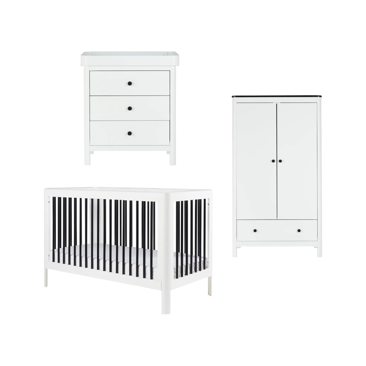 PACKAGE INCLUDES: Ickle Bubba Tenby Classic Cot Bed Ickle Bubba Tenby Changing Unit Ickle Bubba Tenby Wardrobe ICKLE BUBBA TENBY CLASSIC COT BED The Tenby collection boasts a stand-out Scandi style that?s perfect for a modern nursery. With a soft white base is enriched and additional accent detailing, it brings a two-tone look to bubba?s room. With the Tenby Cot Bed, your little one can enjoy cosy nights? sleep from birth until they reach four years old. The three height positions allow you to lower the cot mattress as baby learns to sit and stand, so they?re always safely contained. And with the convertible design, you can transform your full-sized Tenby cot into a toddler bed to take them the rest of the way. The Tenby Cot Bed also comes with teething rails on all four sides of the cot to protect baby?s gums as they start to chew, and to minimise wear and tear to the cot itself. FEATURES: Stylish two-tone design suits modern nurseries Converts from a full-sized cot to a toddler bed Includes 3 heights to lower the mattress as baby grows Includes teething rails on all four sides to protect baby?s gums and the cot Suitable from birth to 4 years, approx. DIMENSIONS: Dimensions: W: 74. 5cm x D: 144. 5cm x H: 84cm ICKLE BUBBA TENBY CHANGING UNIT The Tenby furniture collection boasts a clean, contemporary style that?s perfect for a modern nursery. The soft white base is enriched with wood-effect accents and rounded corners, bringing a fresh two-tone look to bubba?s room. All perfectly finished off with handles. Create space to change baby?s nappy in peace and comfort with the Tenby Changing Unit and Top. The chest of drawers includes a removable changing top so you can lay baby down for those late night changes, then remove it when they reach 12 months to create a stylish piece perfect for an older child?s bedroom. The Changing Unit comes with three drawers so there?s plenty of space for baby?s clothes, changing essentials and more ? and ideal solution if you?re short of s