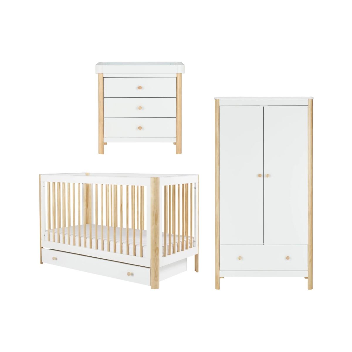 PACKAGE INCLUDES: Ickle Bubba Tenby Cot Bed and Under Drawer Ickle Bubba Tenby Changing Unit Ickle Bubba Tenby Wardrobe Ickle Bubba Tenby Cot Bed and Under Drawer The Tenby furniture collection boasts a clean, contemporary style that?s perfect for a modern nursery. The soft white base is enriched with wood-effect accents, bringing a fresh two-tone look to bubba?s room. With the Tenby Cot Bed, your little one can enjoy cosy nights? sleep from birth until they reach four years old. The three height positions allow you to lower the cot mattress as baby learns to sit and stand, so they?re always safely contained. And with the convertible design, you can transform your full-sized Tenby cot into a toddler bed to take them the rest of the way. The Tenby Cot Bed also comes with teething rails on all four sides of the cot to protect baby?s gums as they start to chew, and to minimise wear and tear to the cot itself. The under drawer lets you maximise the storage space in your nursery, without taking up any more room. The handy drawer slides underneath the Tenby Cot Bed, providing discrete storage that?s quick and easy to access. With castors to help it glide in and out without hassle, it?s an ideal addition to your nursery if you?re short on space. FEATURES: Stylish two-tone Scandi design suits modern nurseries Converts from a full-sized cot to a toddler bed Includes 3 heights to lower the mattress as baby grows Includes teething rails on all four sides to protect baby?s gums and the cot Suitable from birth to 4 years, approx The underdrawer castors to glide in and out easily Ideal for smaller nurseries DIMENSIONS: Dimensions: W: 133cm x D: 62cm x H: 15. 5cm Under Drawer dimensions: W: 133cm x D: 62cm x H: 15. 5cm ICKLE BUBBA TENBY CHANGING UNIT The Tenby furniture collection boasts a clean, contemporary style that?s perfect for a modern nursery. The soft white base is enriched with wood-effect accents and rounded corners, bringing a fresh two-tone look to bubba?s room. All perfe