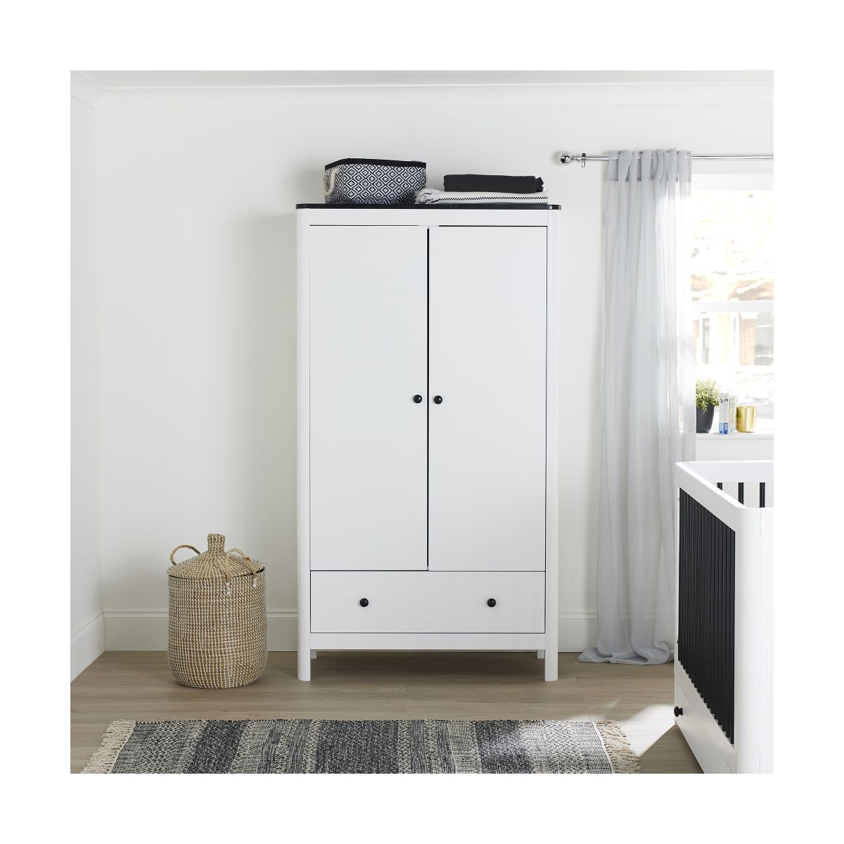 The Tenby furniture collection boasts a clean, contemporary style that?s perfect for a modern nursery. The soft white base is enriched with wood-effect accents and rounded corners, bringing a fresh two-tone look to bubba?s room. All perfectly finished off with handles. Make sure you?re stocked up on all of bubba?s stylish outfits with the Tenby Wardrobe. The large wardrobe has plenty of space and comes with two hanging rails, so you can double up on the outfits you?ve got. And with an additional drawer included, you can sort and organise baby?s essentials easily. Features: Stylish two-tone design suits modern nurseries Pine handles provide a perfect finishing touch The large wardrobe provides plenty of storage An additional drawer allows you to organise baby?s essentials Two hanging rails give you double the space to hang baby?s outfits Dimensions: Dimensions: W: 99cm x D: 49cm x H: 180cm
