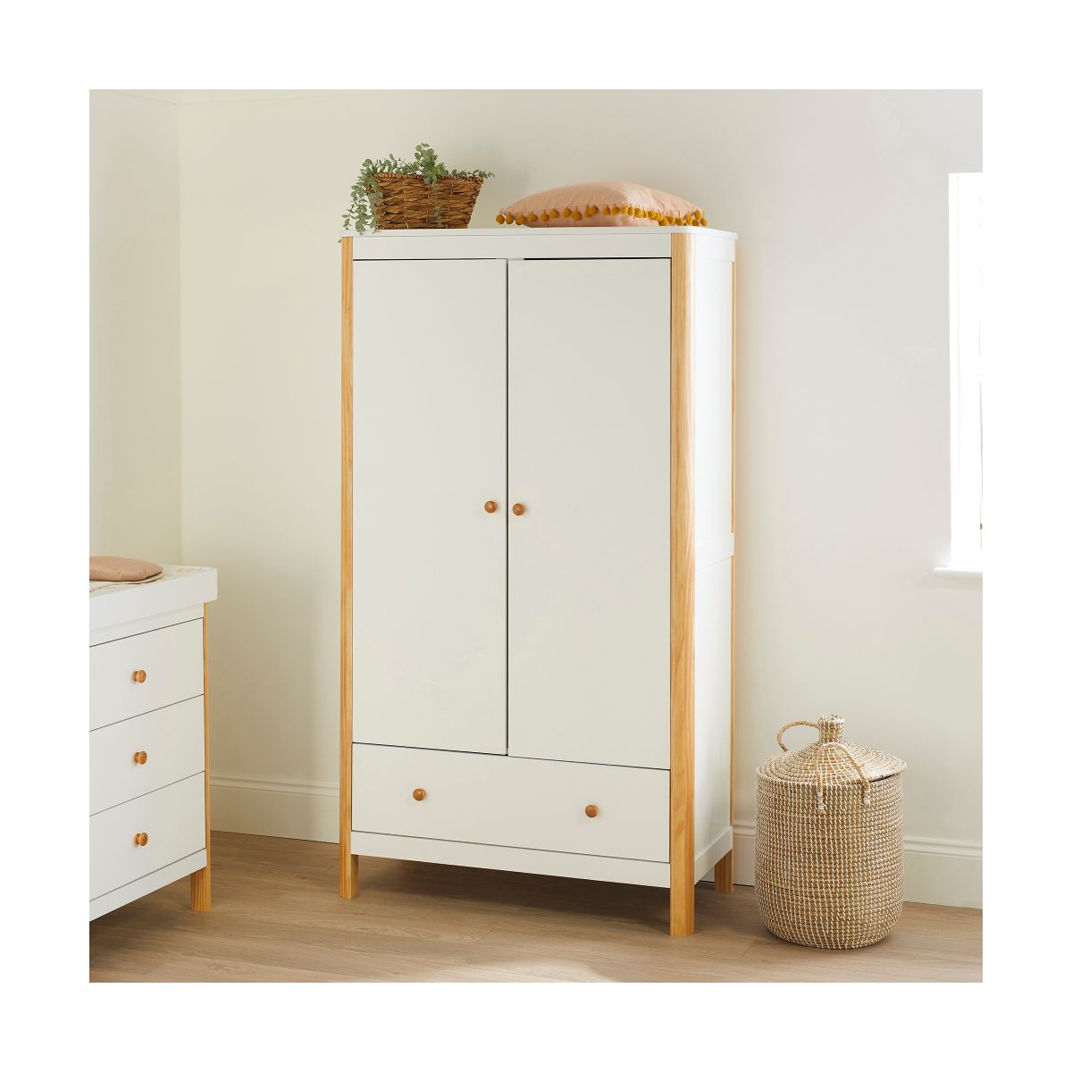 The Tenby furniture collection boasts a clean, contemporary style that?s perfect for a modern nursery. The soft white base is enriched with wood-effect accents and rounded corners, bringing a fresh two-tone look to bubba?s room. All perfectly finished off with handles. Make sure you?re stocked up on all of bubba?s stylish outfits with the Tenby Wardrobe. The large wardrobe has plenty of space and comes with two hanging rails, so you can double up on the outfits you?ve got. And with an additional drawer included, you can sort and organise baby?s essentials easily. Features: Stylish two-tone design suits modern nurseries Pine handles provide a perfect finishing touch The large wardrobe provides plenty of storage An additional drawer allows you to organise baby?s essentials Two hanging rails give you double the space to hang baby?s outfits Dimensions: Dimensions: W: 99cm x D: 49cm x H: 180cm