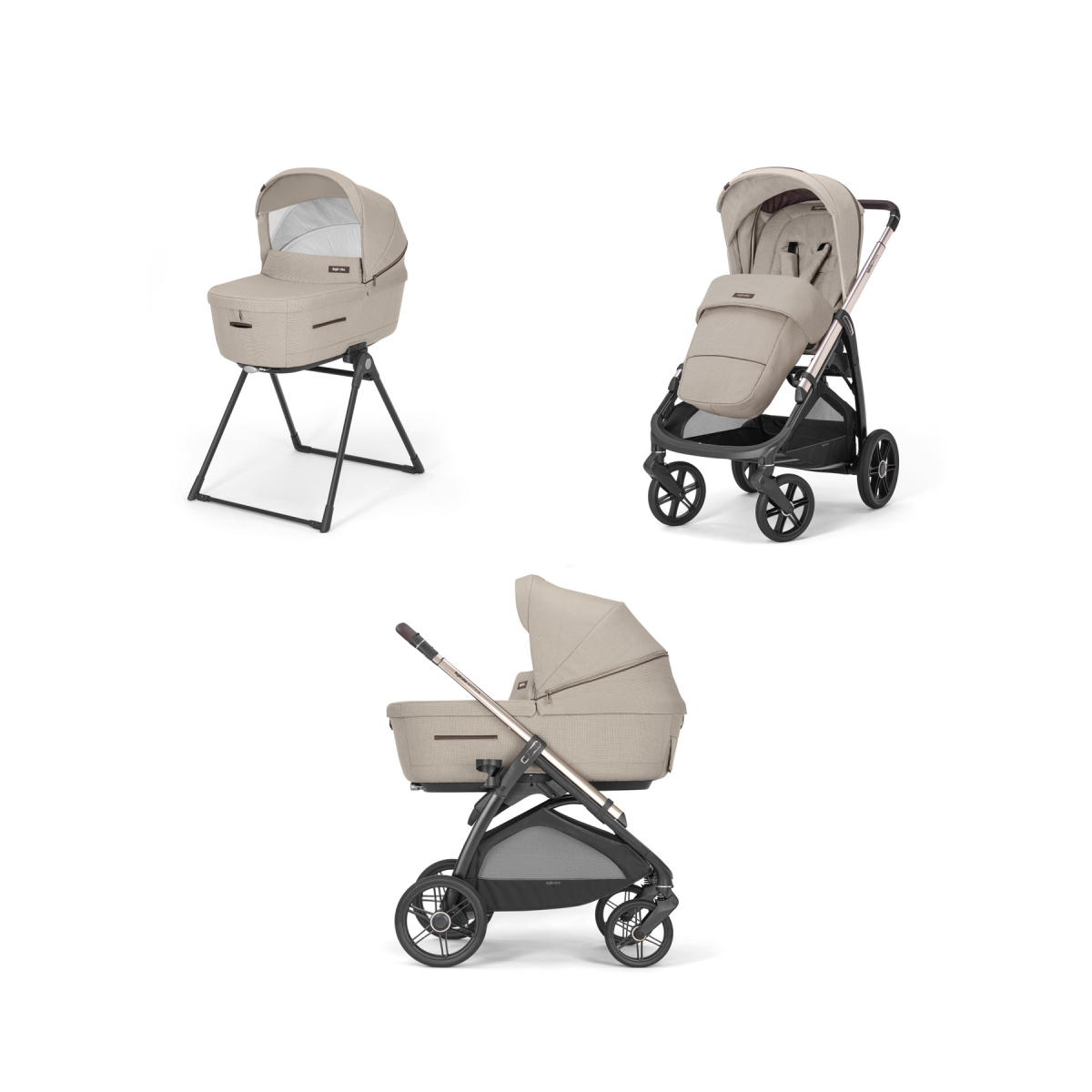 This Package Includes: Inglesina Aptica Chasssis + Seat Unit Pasmina Beige Inglesina Aptica Carrycot Inglesina Aptica the Glam Crossover is Inglesina’s new Quattro Travel System. Inglesina Aptica Chasssis + Seat Unit – Pashmina Beige The Inglesina Aptica stroller has a generous, structured and deep seat which can be used for toddlers up to 22 kg in weight (approximately 4 years of age). It is reversible and folds up with the chassis with just one hand, both forward facing and rear facing. Being just 50 cm wide, it fits in the narrowest of spaces. The solid handle is covered with leatherette and it is height-adjustable thanks to a telescopic mechanism, making it easy to operate, whatever your height. The handles do not touch the ground when the chassis is folded, so your hands have no contact with dirt and germs: hygiene is very important because interaction with your baby is non-stop. The chassis is fitted with large shock-absorbed wheels to tackle with ease both city streets as well as more challenging off-pavement terrains and it opens and folds with just one hand. Features: Suitable for use from birth up to 22 kg in weight (approximately 4 years old). The stroller seat is very easy to attach and detach using the practical central mechanism, and it is reversible, meaning your baby can be parent facing or forward facing. The stroller can be folded with the seat attached to the chassis, both forward and rear facing. The backrest reclines to 7 positions via central controls, for gradual, controlled lowering; the seat becomes horizontal, including the part for the legs, to ensure correct posture and comfort for the baby. Your child’s legs are always supported comfortably by the extending adjustable footrest, to continue to use the stroller even when he or she is asleep. The hood is made of anti-UV treated (UPF50+) Full-Cover fabric to guarantee maximum sun protection when your child is lying fully supine, and it is fitted with an additional hood sun visor for shieldin