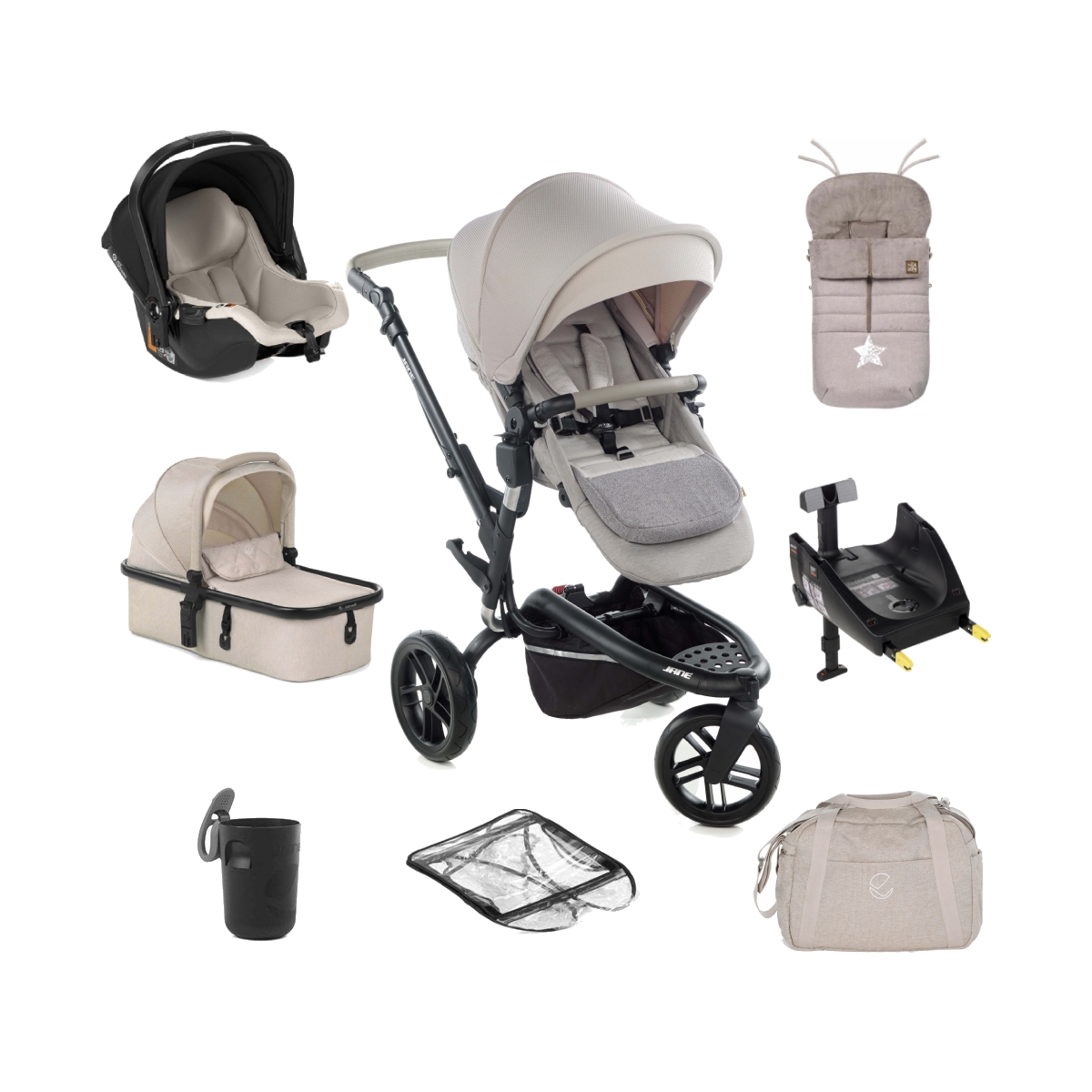 PACKAGE BUNDLE: Jané Trider Pushchair Jané Micro Pro Carrycot Jané Koos i-Size R1 Car Seat Jané iPlatform Comfy iSize Car Seat Base Jané Trider Pushchair Raincover Jané Pram Bag Jané Coordinating and Reversible seat liner Jané Extra large extendable UV50+ hood / canopy Jané Cup Holder Jané Footmuff JANÉ TRIDER PUSHCHAIR Trider is the sportiest pushchair and ideal for discovering new adventures with your baby. With its three large wheels and aerodynamic design, it not only makes it even easier to move on any terrain, but also perfect for spending time outdoors and creating great memories with your little one. The Triders three large high-performance puncture-proof PU rubber wheels are perfect for adapting to any terrain and surface, and the front wheel swivels to give maximum freedom of movement. The brilliant long length suspension stroke, with adjustable shock absorber, delivers maximum comfort for baby. And its higher seating position with reversible seat unit allows you to push baby either facing you or away and see an extraordinary world full of adventures within reach of your pushchair. It?s extremely compact folded size, and the lightness of the aluminium chassis, make it easy to take anywhere. Fitted with the PRO-FIX system (patented) which means carrycots and car seats can be connected quickly and safely with just one movement. FEATURES: Puncture proof all-terrain wheels with Hydrolytic PU tyres Adjustable suspension with central shock absorber optimises your baby?s comfort Extremely compact folding, with or without seat attached Quick release removable wheels Higher seating position allows it to be used as a highchair when out and about Reversible and detachable roomy seat unit Full lie-back, multi-position reclining seat unit with adjustable footrest, suitable from birth Extendable hood with hood visor Inverted ?C? shaped rear structure leaves more room for your feet, making it easier to push Lightweight anodized aluminium tubular chassis Height adjustable