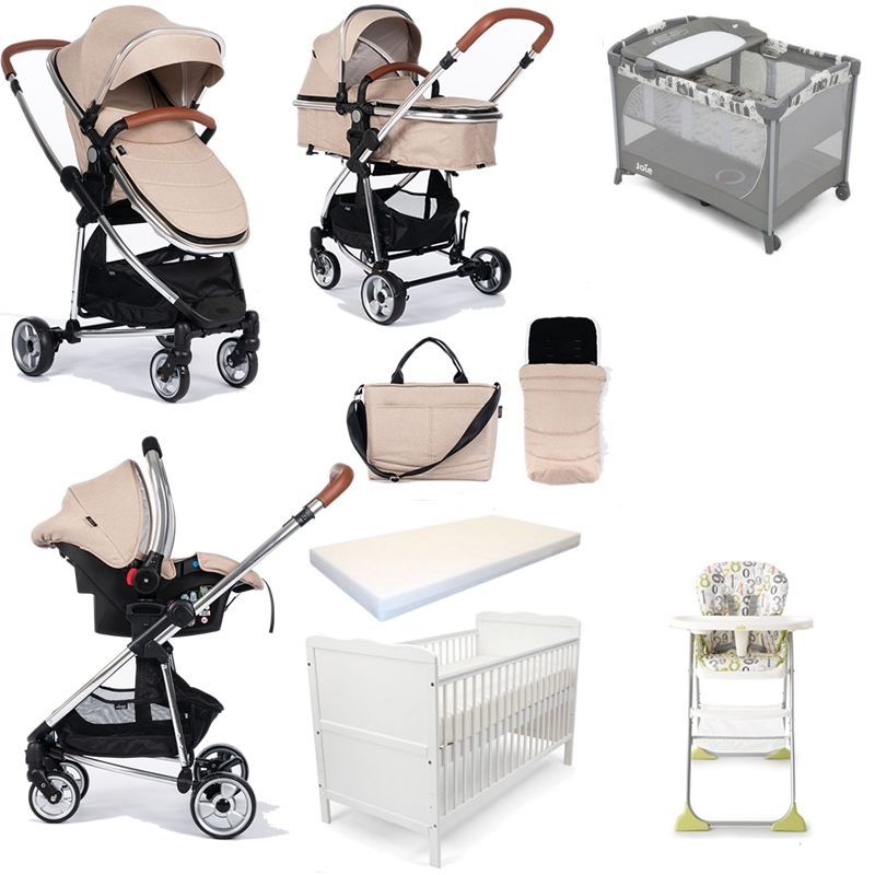 Package Includes: Babyco Belize Pushchair-Beige Babyco Belize Carrycot-Beige Babyco Belize Carseat-Beige Babyco Belize Changing Bag-Beige Babyco Belize Footmuff-Beige Joie Mimzy Snacker Highchair-123 Joie Secure Click Travel Cot Commuter Change-Logan Kiddies Kingdom Cot Bed-White Foam Mattress (140cm x 70cm) Babyco Belize Travel System Your ideal starter travel system complete with Car Seat, Foot-muff Changing Bag & Raincover . The Belize has the looks and is not a wallet breaker. Features: Stylish chrome finish Leather handles Foot-muff with fleece lining. Foot can be used as a liner in the warmer months Changing bag with liner. Push-chair seat suitable from six months. In pramette position it is suitable from birth. Group 0+ Car seat. Parent facing seat and car seat Large basket Viewing window Front swivel wheels Dimensions: Unfolded: 88x59x101cm Folded: 104x59x49cm Joie Mimzy Snacker Highchair-123 Meet the Mimzy Snacker from Joie ? it?s a lightweight and convenient table buddy. You can quickly get it ready or fold it away. Heading out in to the world becomes a whole lot easier. It folds easily with one hand to a conveniently compact size, and includes a fold strap that’s easily accessed in the middle of the seat. With a large 3-position adjustable tray with cupholder, this snacker highchair is a classic option that will last and truly makes life that little bit easier. Features 6 months?3 years old, up to 15kg One hand, quick compact fold and unfold Fold strap easily accessed in middle of seat Stands when folded Extremely compact in folded position Large 3 position adjustable tray with cupholder Unique tray storage on back of legs 3 position seat recline Removable, wipeable seat pad Large storage basket Stationary footrest Soft Touch, 5 point harness Oeko-Tex® certified fabrics Dimensions: H: 102. 5cm x W: 59. 5cm D: 90. 2cm Joie Secure Click Travel Cot Commuter Change-Petite City Made from an ultra-secure frame with modern style exposed tubing, the Joie Commuter Cha