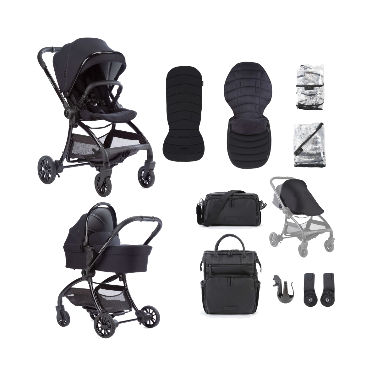 PACKAGE INCLUDES: Junior Jones Aylo Stroller Junior Jones Aylo Stroller Raincover Junior Jones Aylo Carrycot Junior Jones Car seat/Carrycot Adaptors Junior Jones Aylo Carrycot Raincover Junior Jones Aylo Cup Holder Junior Jones Aylo Sun Shade Junior Jones Aylo Seat Liner Junior Jones Essentials Bag Junior Jones Changing Backpack Junior Jones Aylo Luxury Footmuff JUNIOR JONES AYLO STROLLER The Aylo Stroller is a modern parent must-have that pairs style with functionality. The design features a glossy black frame perfectly paired with a luxurious, matt woven fabric. Subtle detailing such as Aylo?s soft-touch, grain leatherette handle and bumper bar act as sleek finishing touches. The Aylo Stroller is designed with your child?s comfort and safety in mind, ensuring your little one is always snug and secure when you?re out and about. The Stroller features a plush head hugger, padded shoulder straps and an easily adjustable 5-point harness, offering your child maximum comfort. An effortless push experience is guaranteed with Aylo?s Tru-Ride2 technology. The stroller?s tyres and suspension have been created for maximum comfort, durability and ease of handling. Sharper handling and better manoeuvrability aren?t the only benefits the Aylo Stroller has. Packed with practical features such as a simple, one-hand compact fold, a flip-flop friendly brake and parent or world-facing seat options, Aylo makes life as a parent easier. Features: Suitable from birth until 4 years One-handed 3 position seat recline – perfect for napping on the go Carrycot with supportive mattress and ventilated base, suitable for occasional overnight sleeping 5-point safety harness with easy, one-hand adjustment Easy access magnetic back panel to adjust hood height and seat harness position Extendable canopy with pop out sun visor Viewing window with mesh ventilation panel Compact, freestanding, one-hand fold A grab and go strap makes carrying your pushchair easy Telescopic handle height adjustment Flip-