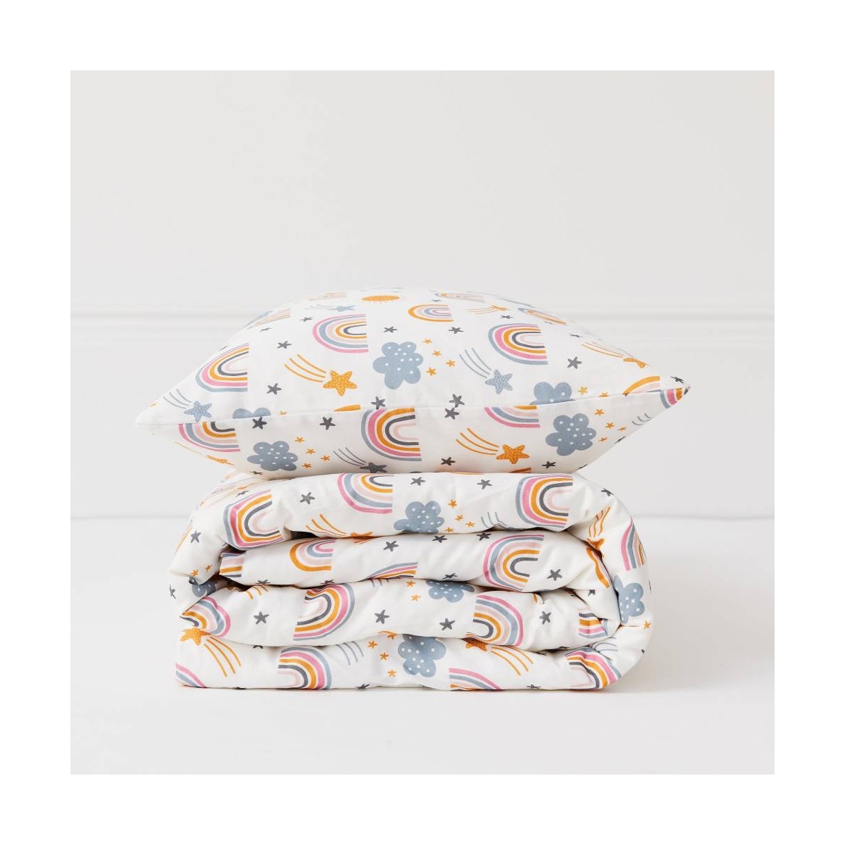 Our Rainbow collection is inspired by the sky and is sure to ignite your little ones imagination. Our charming print is decorated with soft colours in a sky full of rainbows and shooting stars, and is made from only 100% certified organic cotton. Our Rainbow bedding set includes both a duvet cover and a pillowcase, also available in a cot and cot bed size so there’s no need to change your child’s bedroom theme as your little one progresses from a cot to a cot bed. FEATURES: Complete set with duvet cover & pillowcase Fun, colourful and creative print Sustainably made using 100% organic cotton Premium quality, 200 thread count Machine washable & tumble dry