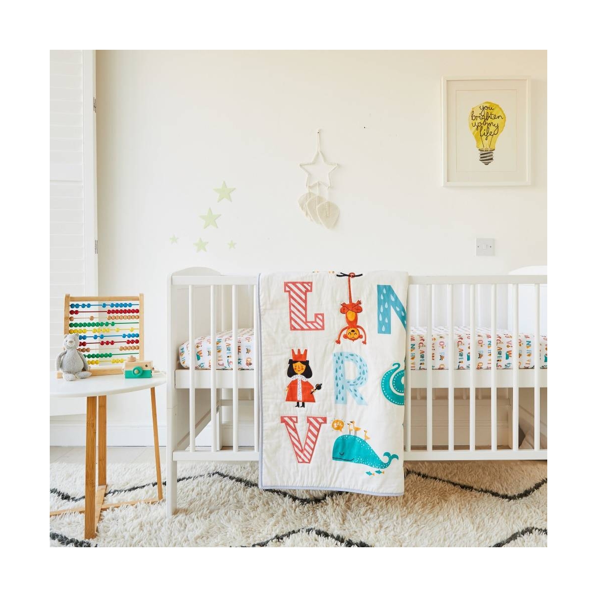 Our Alphabet collection makes it fun for your child to learn their ABCs. Our Alphabet quilt is made from 100% certified organic cotton and features an engaging alphabet with colourful pictures. Plus, the top stitching finish gives our quilt an extra special touch. Our handmade decorative quilts are perfect to use in both a cot and a cot bed, as both a comforter and a bedspread for when your child is ready to progress to a toddler bed. FEATURES: Fun, colourful and creative quilt Complementary decor designed to be the centre piece Beautifully handcrafted Versatile use as a comforter and bedspread Sustainably made using 100% organic cotton