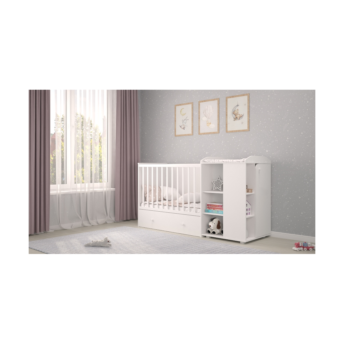 Our multifunctional combination 800 cot with its unique design is suitable for children from 0 months to 3 years old. The 800 cot comes with 1 drawer (on a guide roller) & a 9 compartment dresser unit with a built in changing area at optimal height. Both items offer ample storage space, so that the nursery/room can be tidied up very quickly. The side unit has high curved edges which ensures additional safety for the baby. Only environmentally friendly materials are used in the manufacture of the bed, high-quality MFC chipboard from Kronospan (Austria), child-friendly paintwork. Features: Excellent space saver Recommended for a new born baby to 3 years old Additional storage for storing toys or clothes Comes with 1 drawer and 9 Spacious storage compartments Self Assembly High-quality MFC chipboard from Kronospan (Austria) Takes a cot mattress of dimensions W. 60 x D. 120cm Dimensions: Dimensions: H. 107 x W. 66 x D. 189cm
