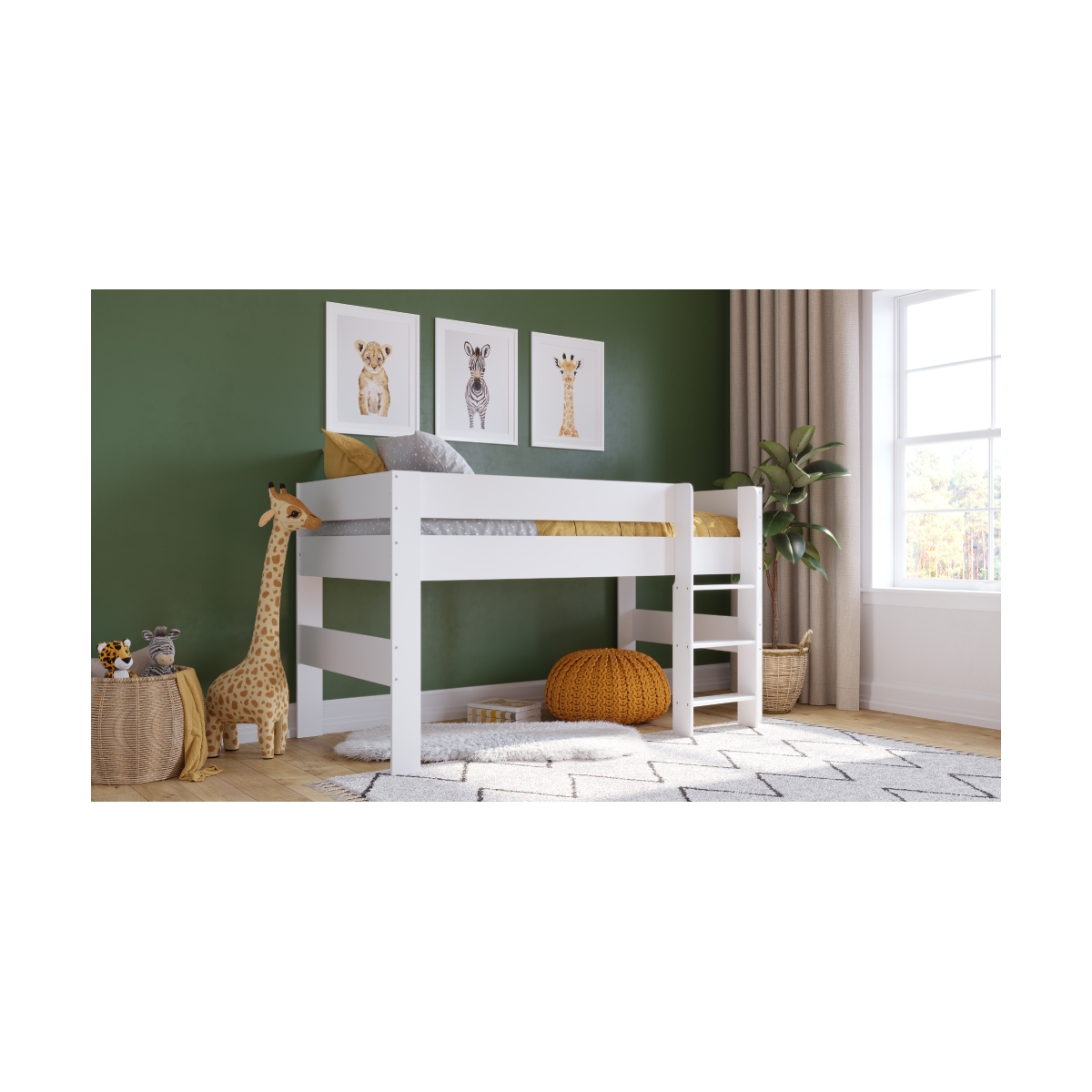 The Coast Mid-Sleeper and Bunk Bed have a design that meet the requirements of any modern bedroom. The straight lines and wide panels give it a contemporary aesthetic, as well as a strong and durable construction that meet all UK and European safety standards. The Coast Mid-Sleeper and Bunk Bed are designed to maximise space in any bedroom, the bunk bed ideal for those who share a room and the mid sleeper allowing space beneath for storage units or play. Fit any room setting that adds calming element and a twist to the norm. The Coast Mid-Sleeper and Bunk Bed has a security rail on the higher sleeping level for a safer sleeping experience. The solid bed slats are designed to allow air flow through the mattress, for both comfort, and to prolong the life of the mattress. The Coast Bunk Bed and Mid-Sleeper will arrive boxed and flat-packed with detailed instructions for an easy self-assembly. Features: Suitable for children over 6 years of age Clean, contemporary design, that suits all modern tastes Maximise space in any room Slatted base for extra comfort and to prolong mattress life Sturdy design with integrated ladder Easy self-assembly with clear instructions Dimensions: Size: H113. 5 x W109. 5 x D197. 5 Weight: 55 kg