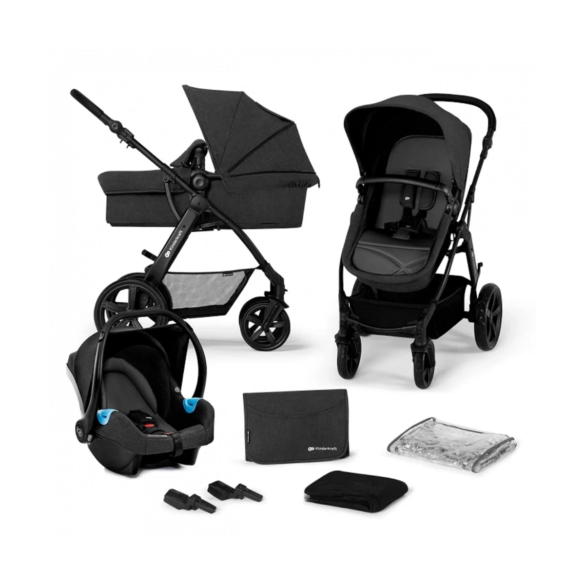This Package Includes: Kinderkraft Moov Stroller – Black Kinderkraft Moov Carrycot – Black Kinderkraft Mink Car Seat – Black Kinderkraft Car Seat Adapters Kinderkraft Practical Bag – Black Kindrekraft Raincover Kinderkraft Mosquito Net This is MOOV CT, a 3-in-1 pushchair designed for children from birth to approximately 22 kg. Thanks to the 2-in-1 seat, you?ll have one element that you?ll first use as a pram, and then as a stroller. you?ll save money and space when storing individual pushchair elements. In addition, all you need is universal adapters to affix the 0-13 kg car seat (included). This Travel System allows you to go on a quick shopping trip without needing to wake your child if they?ve fallen asleep in the car. You can adjust the seat using one hand, and the handle can be easily adapted to your height ? you can configure the pushchair to suit both your and your child?s needs in just a moment. This is a pushchair created for parents who want to make parenthood easier. Features: Suitable From birth up to 22 kg 0-13 kg car seat and adapters included in the set STOP & RIDE brake ? operated from the top Extendable footrest for older children The straps can be stored in the pockets (in the pram function) Accessories: rain cover, bag, mosquito net and leg warmer Basket with a capacity of 4 kg Lock to prevent unfolding during transport 2-in-1 seat Lightweight and easy to manoeuvre Puncture-resistant wheels with shock absorbers Multi-functional Tailored to the child and parent Dimensions: Unfolded pushchair: 90 x 60 x 105 cm Folded pushchair: 74 x 60 x 35 cm Wheels: front 20 cm, rear 30 cm Length of seat in lie-flat position: 82 cm Seat width: 33 cm Backrest width 33 cm Parent handle: 99-101. 5-104-106. 5 cm Internal pram dimensions: 33 x 82 x 20 cm External pram dimensions: 44 x 90 x 16 cm Weight: 19. 4 kg Weight of standalone pushchair: 12 kg