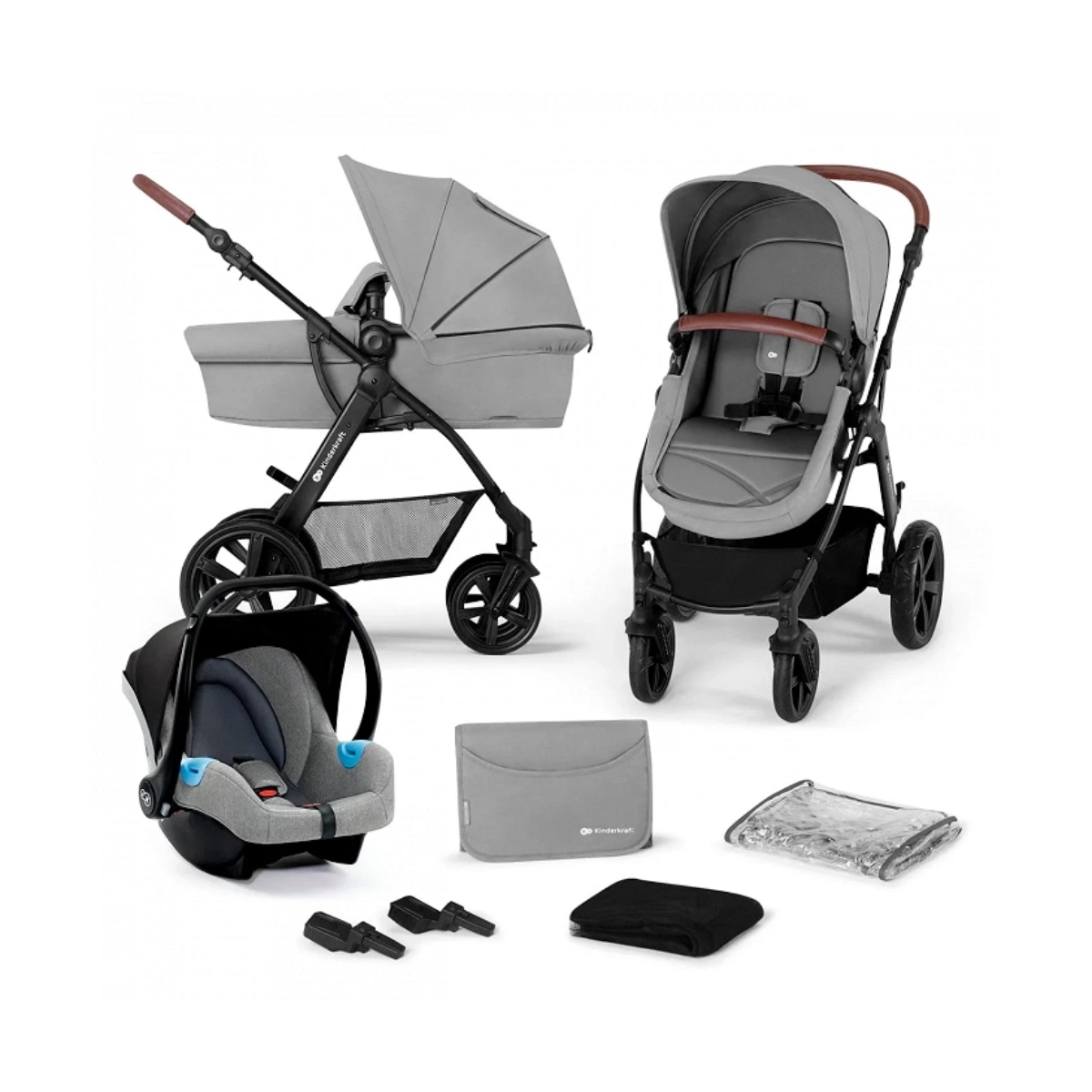 This Package Includes: Kinderkraft Moov Stroller – Grey Kinderkraft Moov Carrycot – Grey Kinderkraft Mink Car Seat – Grey Kinderkraft Car Seat Adapters Kinderkraft Practical Bag – Grey Kindrekraft Raincover Kinderkraft Mosquito Net This is MOOV CT, a 3-in-1 pushchair designed for children from birth to approximately 22 kg. Thanks to the 2-in-1 seat, you?ll have one element that you?ll first use as a pram, and then as a stroller. you?ll save money and space when storing individual pushchair elements. In addition, all you need is universal adapters to affix the 0-13 kg car seat (included). This Travel System allows you to go on a quick shopping trip without needing to wake your child if they?ve fallen asleep in the car. You can adjust the seat using one hand, and the handle can be easily adapted to your height ? you can configure the pushchair to suit both your and your child?s needs in just a moment. This is a pushchair created for parents who want to make parenthood easier. Features: Suitable From birth up to 22 kg 0-13 kg car seat and adapters included in the set STOP & RIDE brake ? operated from the top Extendable footrest for older children The straps can be stored in the pockets (in the pram function) Accessories: rain cover, bag, mosquito net and leg warmer Basket with a capacity of 4 kg Lock to prevent unfolding during transport 2-in-1 seat Lightweight and easy to manoeuvre Puncture-resistant wheels with shock absorbers Multi-functional Tailored to the child and parent Dimensions: Unfolded pushchair: 90 x 60 x 105 cm Folded pushchair: 74 x 60 x 35 cm Wheels: front 20 cm, rear 30 cm Length of seat in lie-flat position: 82 cm Seat width: 33 cm Backrest width 33 cm Parent handle: 99-101. 5-104-106. 5 cm Internal pram dimensions: 33 x 82 x 20 cm External pram dimensions: 44 x 90 x 16 cm Weight: 19. 4 kg Weight of standalone pushchair: 12 kg