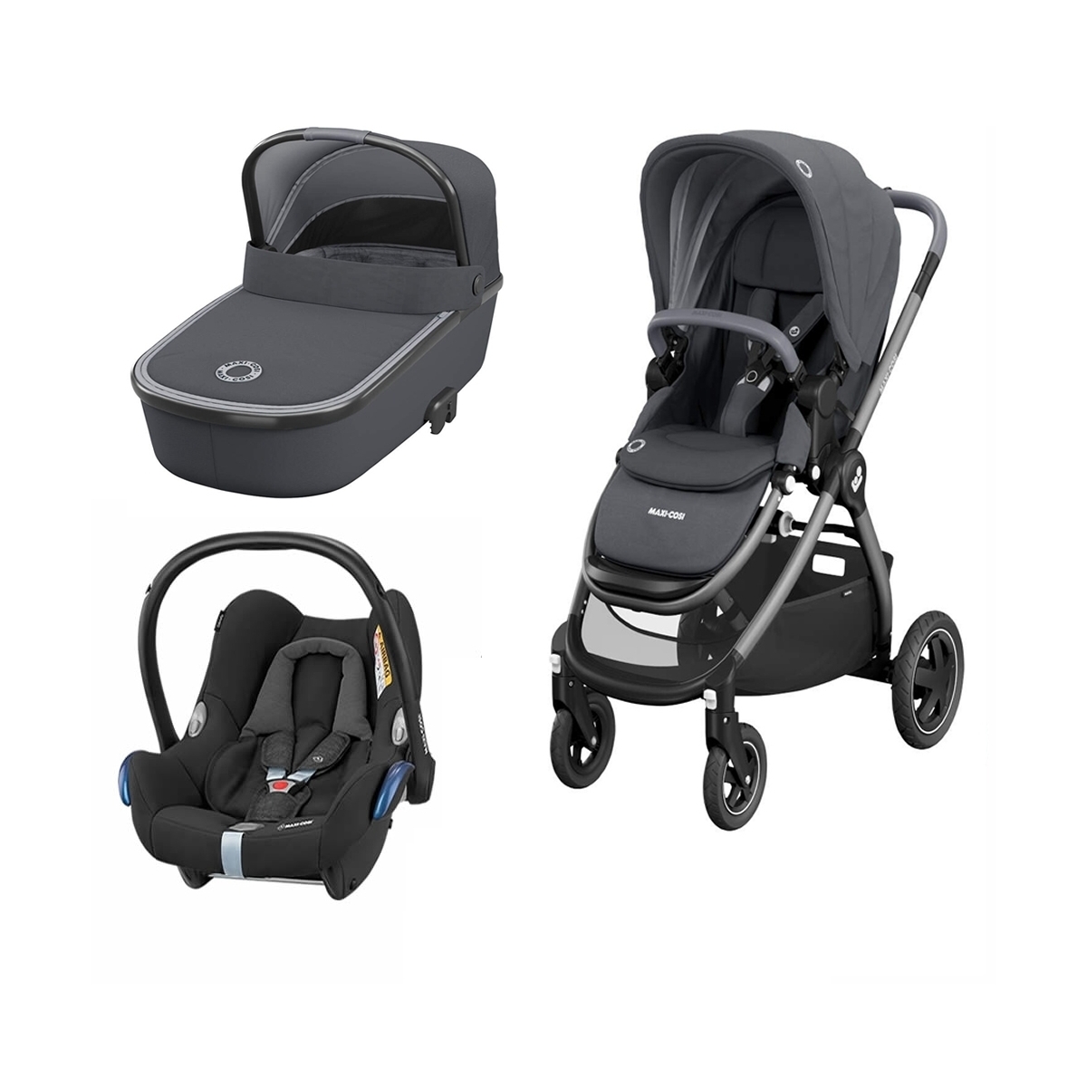 Package Includes: Maxi Cosi Adorra Stroller Maxi Cosi Oria Carrycot Maxi Cosi Cabriofix Group 0+ Car Seat Maxi Cosi Adorra Stroller: Families love the Adorra? Stroller! It has the supreme comfort you want to provide your child and all the features you?ve come to expect from a premium Maxi-Cosi product. You?ll enjoy taking strolls with your newborn in carriage mode which features a full recline and provides a secure enclosed space to keep your baby comfy starting right from birth. As they grow, you can use the stroller mode with the seat in either parent or forward-facing positions, allowing your child to see you during the ride or giving them a view of the road ahead. The stroller includes a Cozi-Dozi? infant support for smaller babies and the super soft fabrics and padding ensure a comfy ride. You?ll be comfortable too with an adjustable handle that you can customize to the best height. The extra-large basket flips down for easy access and expands to fit larger items. The seat liner not only makes the Adorra? the comfiest stroller for your baby, but also reverses so that you can easily get a new look. When you?re finished enjoying your day out with baby, the stroller folds easily with the seat attached in either direction, making it easy to store. The Adorra? Stroller is also super easy to clean thanks to the machine washable and dryer safe seat pad. Features: Carriage mode with full recline gives infants a comfy ride from birth Includes Cozi-Dozi? infant support for smaller babies Rear-facing seat allows child to see parent Forward-facing seat gives child a view of the road ahead Reversible seat reclines in both forward and rear facing positions Adjustable handle lets you customize to the best height Extra-large basket flips down for easy access and expands to fit larger items Canopy with peek-a-boo window and flip out visor One hand compact fold ? folds with the seat on Reversible, machine washable and dryer safe seat pad For children from birth to 50 pounds Maxi