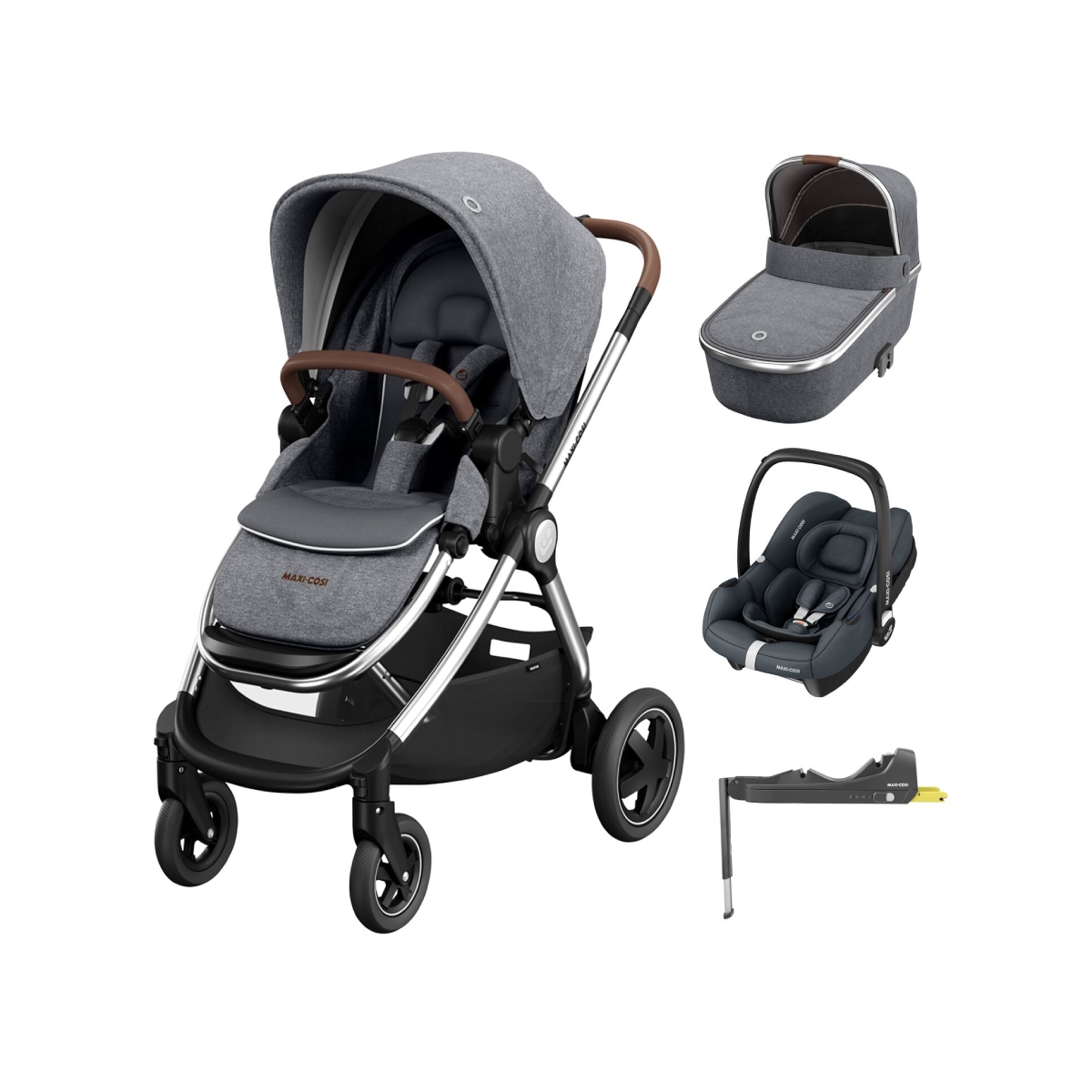 PACKAGE INCLUDES: Maxi Cosi Adorra Luxe Stroller Maxi Cosi Oria Carrycot Maxi Cosi Cabriofix i-Size Car Seat Maxi Cosi Cabriofix i-Size Base MAXI COSI ADORRA LUXE STROLLER This perfect pushchair is perfect for urban living; versatile enough to be able to fold up compactly for hopping on and off public transport but with a large seat for your child’s comfort and still plenty of room for shopping! It?s covered in luxurious fabrics and has a well-padded, large seat unit that can be positioned forward facing or parent facing as required. The canopy is ultra-extendable for full cover, keeping your little one safely away from harmful sun’s rays on those brighter days. The seat can fully recline to a lie-flat position, making it suitable for use from birth or for a nap. A five-point harness with padding keeps your little one held comfortably and safely in place as you travel together, and the bumper bar is removable so you can easily install your child. For further comfort, the backrest and leg rest adjust simultaneously, and a rain cover is included to keep your little one dry in case of sudden showers- you can store it in the large under-seat basket when not in use. This pushchair has a contemporary styling with a leather look finish and 4 sturdy wheels. The front wheels can be locked for straight line trekking or set to swivel for nipping through the city streets. The back wheels have an easy braking system so you can come to a stop quickly and the Adorra benefits from a compact fold even when the seat is in place. When folded, the pushchair can stand upright for easy storage, and to keep the fabrics clean. You can remove the seat and wheels for an even more compact fold. The pushchair is lovely to push and has an extendable handlebar to suit parents of any size. Features: Suitable from birth to 15kg (Approximately 3. 5 years) Forward and parent facing Car seat and carrycot included Free-standing compact fold Lie-flat recline for extended use from birth Free-standing com