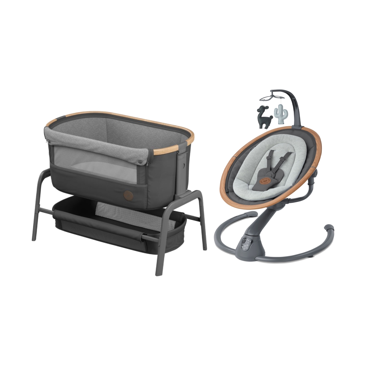 Package Includes: Maxi Cosi Iora Co-Sleeper Crib Maxi Cosi Cassia Swing Maxi Cosi Iora Co-Sleeper Crib And just because it?s time to sleep doesn?t mean your bonding time has to end. Thanks to the Iora?s five different height positions and easy co-sleeping slide function, your baby always fits perfectly next to you. Going away for a little trip or is your little one going on a sleepover at grandma?s house? No worries. You can easily fold and take the cozy Iora with you in its convenient travel bag. A baby?s life is full of firsts. Exhausting! There?s no better way to end a day of discovering all kinds of new sensations than with a safe and sound night?s sleep. Whether you need to feed, change a diaper, or even the sheets in the middle of the night, all the essentials are within reach in Iora?s large storage basket. This means you can rest easy at all times, and your little one can dream about all the memories made that day, just like you. Ready to give your little one their own space? Simply move Iora to the baby?s room. Its comfortable mattress and sturdy frame are perfect to double as a stand-alone crib. And your baby can continue sleeping in their own, familiar bed. The Maxi-Cosi Iora. At the end of the day it?s all about comfort. FEATURES: Suitable from birth up to 9KG Most comfortable mattress Easy slide function Large storage basket Easy to fold and carry 5 height positions Convenient travel bag Sturdy frame Mesh Window Doubles as a stand-alone crib Maxi Cosi Cassia Swing As a (new) parent, we know you can never get enough of holding your little one. It?s just that with working, cooking, laundry, sometimes you simply need both hands free. Imagine a smart set of extra arms to comfort your baby during those moments. Maxi-Cosi Cassia ? a stylish and smart electric swing for babies from birth to 9 kilos ? was developed for moments like these to lend a helping hand. COMFORT This stylish newborn baby swing has the beauty and the brains ? just like you it instinctively