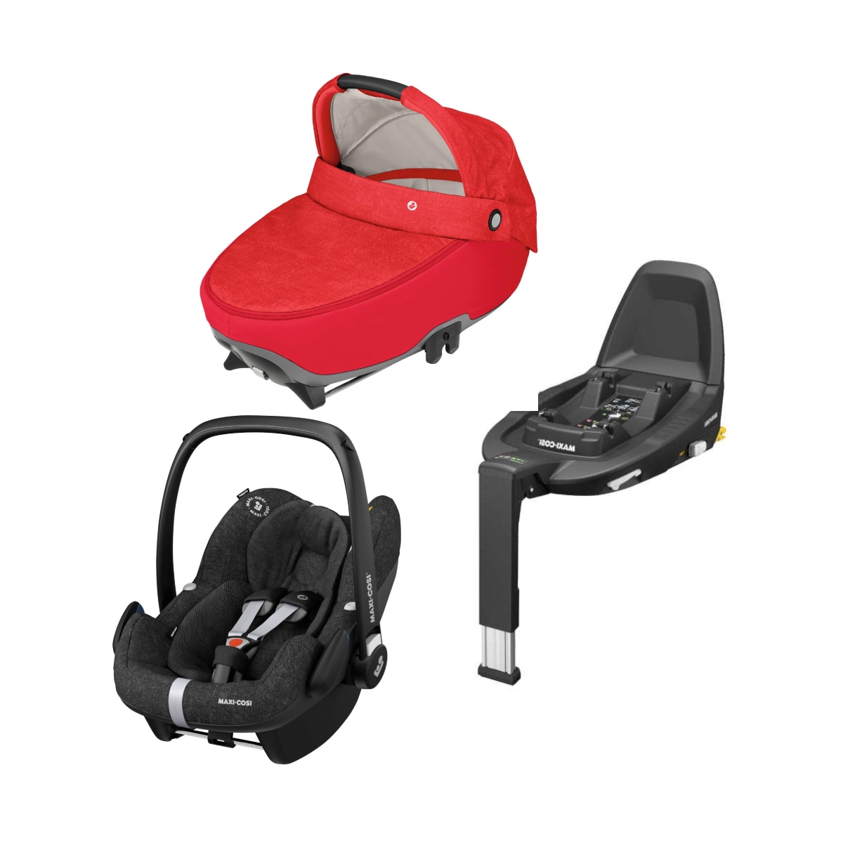 This Package includes: Maxi Cosi Jade Carrycot Maxi Cosi Pebble Pro Car Seat-Nomad Black Family Fix3 Isofix Base Maxi Cosi Jade Carrycot The Maxi-Cosi Jade Carrycot in Nomad Red is suitable from birth up to 6 months (40 cm to 70 cm & approx. 9KG) and allows your little one to sleep undisturbed whilst travelling. With the soft-touch seat reduction, comfy mattress and flat recline position, your little one can relax and nod off on short or longer journeys feeling safe and secure. The built-in protective blanket and the sun canopy provide your baby with the appropriate protection in every season. Thanks to the Slide & Go technology, attaching the Jade is very simple. An acoustic and visual signal confirms that you have attached the carrycot securely. The Jade Carrycot is compatible with the 3Way Fix base (available separately) and connects simply to the rear seats using your car’s ISOFIX anchors, to protect your child with the highest R129 safety standard. A 3-point harness keeps your little passenger safely in the carrycot while driving. The outer shell of Jade is made of shock-absorbing material and guides the forces of an impact away from your child. The modern, eye-catching Jade Carrycot will attract compliments where ever you go. Maxi Cosi Pebble Pro Car Seat- Nomad Black Looking for safe, comfortable and easy travel with your newborn? Discover Pebble Pro i-Size. The Pebble Pro i-Size is a state-of-the-art infant carrier providing the best safety to your little one as it complies with the very latest car seat regulation called i-Size (R129). The memory foam integrated in the side wings ensures a very high protection. The included baby-hugg inlay offers additional side body protection for the newborn while it also provides a perfect ergonomic position for comfortable travel. The cushioned and adjustable headrest will always guarantee the best head support to your baby. The Pebble Pro i-Size is a must-have car seat as it also offers the highest ease of use thanks to t