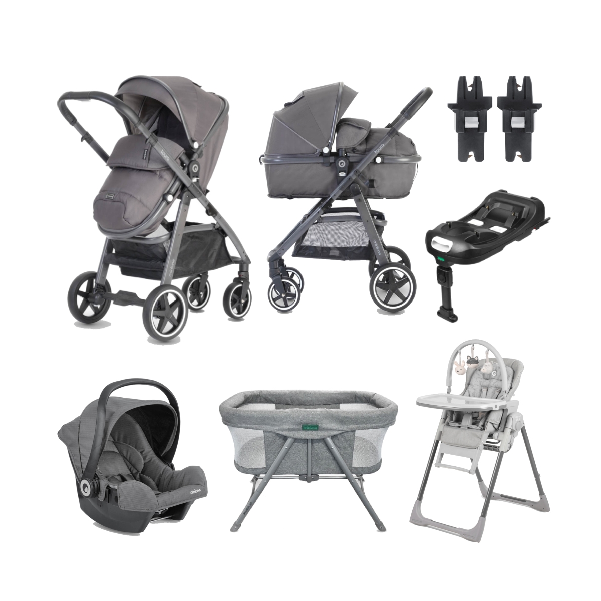 PACKAGE INCLUDES: miniuno Special Edition Gunmetal Toura Chassis miniuno Newborn Carrycot with hood & apron miniuno Carrycot Adaptors miniuno Luxury Changing Bag with Changing Mat miniuno Padded Footmuff miniuno Secure Fix Group 0+ car seat miniuno Car Seat Adaptors miniuno Ventilated rain cover miniuno Swift Fold2 Bedside Crib miniuno Yumo Multi Plus 4-in-1 Highchair miniuno Secure Fix ISOFIX Base miniuno TOURA Gunmetal CHASSIS TRAVEL SYSTEM The Special Edition Gunmetal Toura has all the great features of the standard Toura Travel System, but with a chromed chassis and a brand new, high-quality, luxurious fabric. The special edition also features a matching Secure Fix group 0+ car seat and a luxury changing bag for all your baby?s essentials! The miniuno Toura is a stylish, modern pram, pushchair and travel system that makes life with your growing baby simple. The newborn carrycot features a padded liner and can be used up to around 9kg. The stroller seat has both a cosy footmuff and a padded summer liner and can be used forward and parent facing up to around 15kg. The robust Toura chassis folds down extremely compactly, making travelling with your baby simple. FEATURES: miniuno SPECIAL EDITION Gunmetal TOURA CHASSIS: Gorgeous chromed Gunmetal finish Puncture-proof PU tyres All-round 4-wheel suspension Telescopic handle (3 positions) Large shopping basket Freestanding when folded Stylish exposed tubing + basket miniuno SPECIAL EDITION Gunmetal TOURA STROLLER SEAT: Suitable from birth to 15kg Fleece-lined footmuff with built-in hand warmers Forward & rearward facing Padded liner for summer months Adjustable 2 x height canopy/hood Pop-out sun visor Leatherette bumper bar Parent viewing window miniuno SPECIAL EDITION Gunmetal TOURA CARRYCOT: Suitable from birth to 9kg Leatherette carry handle Padded liner for newborns Removable apron cover Parent viewing window Forward and rearward facing Pop-out sun visor Includes a rain cover miniuno SECUREFIX GROUP 0+ CAR SEAT: Suitable