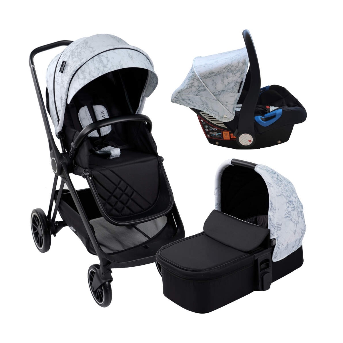 Includes: MB250 stroller FREE head hugger, tummy and chest pads FREE Rain cover (for pushchair only) Group 0+ Infant Carrier Car Seat Coordinating Detachable Bassinet Description: The Your Babiie Marble Stroller design with Nicole “Snooki” Polizzi is uniquely designed to adapt as your family grows. The bassinet that comes with the stroller keeps your precious little one comfortable and cosy and also attaches to the stroller frame for family strolls and fresh air. The stroller itself has an extended canopy, fashionable fabrics and PU leather details, a large storage basket and a seat unit which can be both parent and world facing. Also included is a Group 0+ Infant Carrier Car Seat that makes the transfer from car to street seamless, without disrupting your little one’s sleep. This can also attach to the stroller frame with the adaptors supplied and is compatible with the My Babiie Isofix Base (sold separately). What age range is this product appropriate for?The My Babiie MAWMA Nicole Snooki Polizzi Victoria Travel System is suitable from birth. What should I complement my Marble My Babiie MAWMA Nicole Snooki Polizzi Victoria Travel System with?The Your Babiie Nicole Polizzi MAWMA Rose Gold Marble Premium Highchair is the perfect accessory to complement the My Babiie MAWMA Nicole Snooki Polizzi Victoria Travel System. We would also recommend the My Babiie MAWMA Nicole Snooki Polizzi Changing Bag (Pink Camo) Pushchair Features Suitable from birth to maximum 15kg Lockable front swivel wheels Adjustable back rest Lightweight & strong aluminium chassis Easy compact fold technology Extendable 3 position canopy Padded removable front bar Includes detachable bassinet for newborns Large storage basket Car Seat Features Group 0+ suitable from birth to 13kg/29lbs Breathable fabrics Rearward facing on front & rear vehicle seats3 point safety harness Side protection Conforms to ECE R44/04 Specifications Assembled stroller size: 104 x 54 x 88 cm (Hx Wx D) Folded stroller size: 74 x 36. 5 x 55 (Hx Wx
