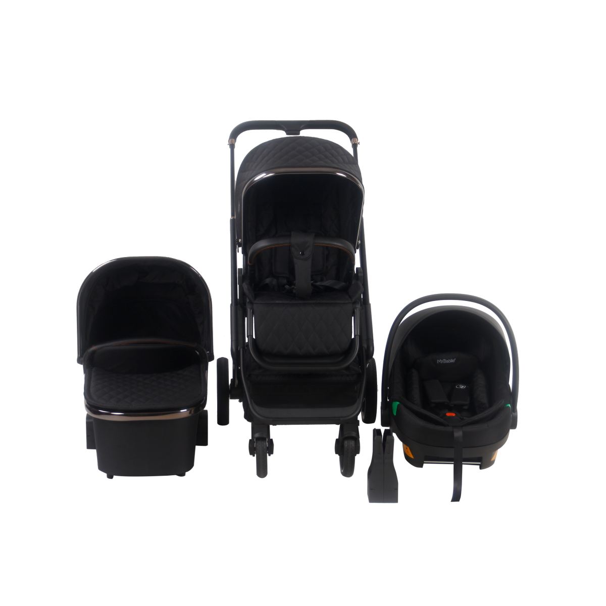 This Package Includes: My Babiie 500i Pushchair My Babiie 500i Carrycot My Babiie Group 0+ iSize Car Seat My Babiie Car Seat Adapter My Babiie Footmuff My Babiie Raincover The My Babiie MB500i iSize travel system is a luxurious and innovative travel system designed to cater to the needs of both parents and babies. This travel system comes with a range of advanced features that make it a great option for parents who want to travel with their baby in style, comfort, and safety. Designed with Billie Faiers as part of her Signature Range, the quilted midnight black fabrics are contemporary and chic, paired with a shiny gunmetal frame for a fashionable and sleek finish. One of the key features of the MB500i iSize travel system is its iSize compatibility, which means it meets the latest safety regulations for child car seats. This ensures that your baby is kept safe and secure during car journeys. The system includes a car seat that can be used from birth to 13kg, and it can be easily attached to the chassis of the pushchair. The MB500i iSize travel system is also designed to be lightweight and compact, making it easy to carry and manoeuvre. The large comfy seat unit can be positioned either parent or world facing and it’s easy fold makes it quick and convenient to set up. The travel system can be used from birth, and it includes a carrycot that can be used until your baby is six months old or 9kg. The pushchair seat can be used from birth to 22kg, and it can be reclined to multiple positions, allowing your baby to sit upright or lie flat as needed. The MB500i iSize travel system also comes with a range of other features to make your life easier as a parent including a large shopping basket, making it easy to carry your essentials with you when out and about and height adjustable handles. Features: Suitable from birth up to 22kg Single front wheels for an ultra smooth ride Height adjustable push handle Lightweight design for maximum portability Easily folds neat & compact