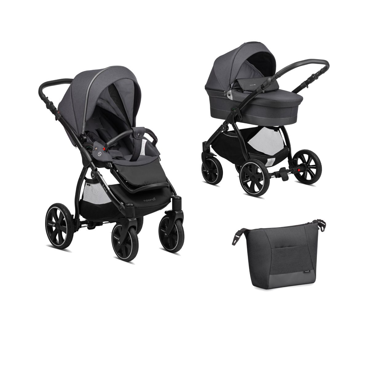 Package Includes: Noordi Sole-Go Chassis Noordi Sole-Go Foldable Carrycot Noordi Sole-Go Carrycot Apron Noordi Sole-Go Pushchair Seat Unit Noordi Sole-Go Pushchair Apron/Footmuff Noordi Pram Changing Bag Noordi Sole-Go Raincover Noordi Sole-Go Insect net Noordi Cup holder Noordi Mattress Noordi Sole-Go Pushchair The Noordi Sole Go is compact folding pushchair inspired by the Norwegian way of life and offers optimal comfort for outdoor strolls. Durable aluminium chassis with Real-Gel? wheels and adjustable shock absorption system ensures excellent ride on any terrain like forest trails, sand or snow. The One-Click? braking system ensures the highest safety. The handlebar with luxe eco-leather grips can be adapted to match your height. Extra-large shopping bag allows you to put in your baby’s essentials. The Sole Go seat unit creates an oasis for extremely comfortable travel thanks to the reclining backrest and adjustable footrest, which allows you to set the seat in a horizontal position. The seat unit can be also reversed from parent facing to world facing direction to stimulate your baby’s visual sensations. A 5-point harness system with soft cushions and bumper bar with protection belt ensure your baby is securely and comfortably fastened. Features: Wide and comfortable seat unit with adjustable backrest. Completely lie-flat seat option (suitable for new-borns) for cosy naps on the road. Removable eco-leather bumper bar. Forward or rearward facing positions for the seat unit Four-wheel adjustable shock absorption system ? provides smooth rides. Puncture proof tyres – REAL-GEL? WHEELS are filled with a special gel that extends the durability and makes sure that no additional maintenance of the wheels is required. All-around safe chassis folding system. Quick release wheels for more compactness. One-click? brake system. Adjustable hardwearing eco-leather handlebar. Lockable front swivel wheels. Large capacity shopping basket. Aluminium chassis. Dimensions: Adjustabl