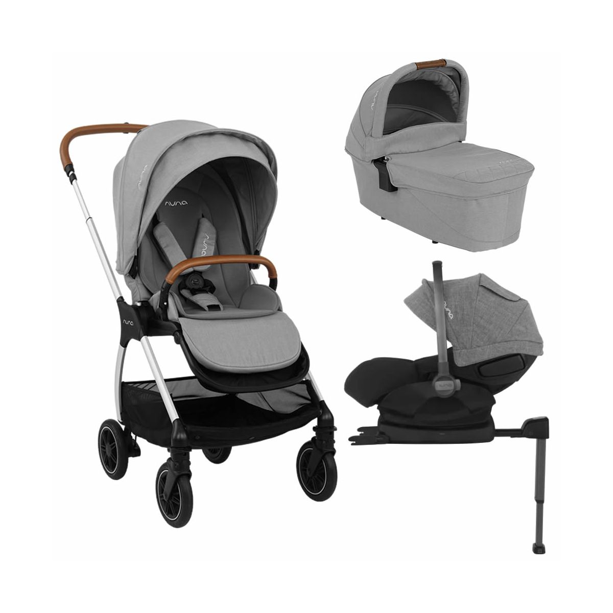 This Package Includes: Nuna Triv Stroller Nuna Triv Carrycot Nuna Arra I-Size Car Seat Nuna Triv Pushchair The Nuna TRIV stroller is the everyday travel companion. Perfect for city-living or jet setting travellers, the TRIV includes a quick, compact one-hand fold, spring suspension technology, all-wheel suspension and adjustable support for your little one. The TRIV has been cleverly designed with a seat that can face both ways and fold both ways, and can easily convert to a travel system (with optional accessories ? sold separately). Features: Suitable frm birth to 22kg Forward and rearward facing seat unit Travel system ready with included ring adapter Lightweight compact one-hand fold Spring suspension technology All-season seat 4 position recline No re-thread harness Water repellent UPF50+ canopy Luxe leatherette accented handlebar and bumper bar Seat faces both ways and easy to fold flat, whatever the direction baby has been facing Adjustable calf support Folds up quickly with one hand and stands on its own Quick release, 5 point, no re-thread harness converts to a 3 point harness All wheel suspension, one-touch brake and front swivel wheel lock Merino wool insert Handy storage pocket and oversized storage basket Dimensions: L81 x W52 x H109cm Weight: 8. 8kg Nuna Triv Carrycot Take your little one to the land of nod with the Nuna Triv carrycot. Designed to be exclusively used with the Triv pushchair. Clicks simply on to the Triv chassis it is the perfect addition to keep your infant comfortable and relaxed on trips out. Features: Suitable from birth To be used with the Nuna Triv Pushchair Mattress cover and top cover are machine washable Integrated mesh window Incorporated storage pocket Luxe hand-sewn leather-look carry handle Nuna Arra I-Size Car Seat For those busy days and long journeys, the ARRA provides a smooth transition from crib to carrier. Its three recline positions allow baby to lie comfortably, whether ARRA is buckled in the backseat or attached to