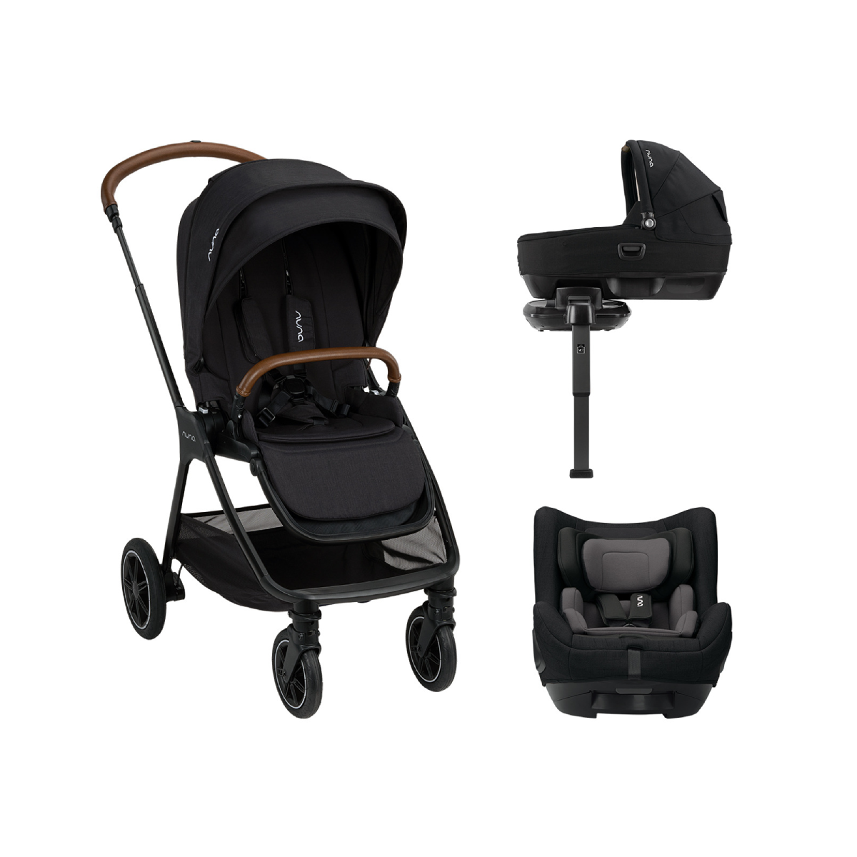 Package Includes: Nuna TRIV Next Caviar Stroller Nuna CARI Next Caviar Carrycot Nuna TODL Next iSize Group 0+ Caviar Car Seat Nuna Base Next Rotating Isofix Caviar Base Nuna TRIV Next Caviar Stroller: A morning stroll to the park or afternoons in your favourite coffee spot, every day out and abouts with the baby are fuss-free with the TRIV? next pushchair. It?s a natural city dweller that quickly converts to a travel system, packs up easily and stands on its own when folded, becoming the perfect sidekick to your everyday adventures. Engineered for convenience and comfort, the all-wheel suspension, one-touch braking system, and large rear wheels promise easy manoeuvrability and cushiony smooth city strolls – like riding on air with complete peace of mind. This compact fold pushchair is cleverly designed with a seat that faces and folds both ways, no matter what direction the baby’s facing. The all-season seat keeps your precious cargo snug in winter and converts to breathable mesh in summer, while the rain cover provides extra protection no matter the weather. Features: Recommended use: Birth to 22kg Seat faces both ways and easy to fold flat, whatever direction baby?s been facing Spring suspension seat technology for smooth rides Magne Tech secure snap? – the self-guiding magnetic buckle that automatically locks into place Dimensions: Product: L85cm x W57. 5cm x H105. 5cm Product Folded: L31. 5 x W57. 5 x H69 cm Product weight: 9. 15kg (8. 72 w/o insert & armbar) Nuna Cari Next Caviar Carrycot: Every parent needs a trusty travel companion to enjoy those everyday adventures that are waiting around the corner. CARI next is Nuna’s carrycot car seat. The super comfortable CARI next allows the baby to lay peacefully at a full recline – the best position for a developing spine. This NEXT system compatible carrycot features an organic jersey mattress and infant inserts that add comfort and a 3-point harness that adds security. You can travel from home, to car, to pushchair, where