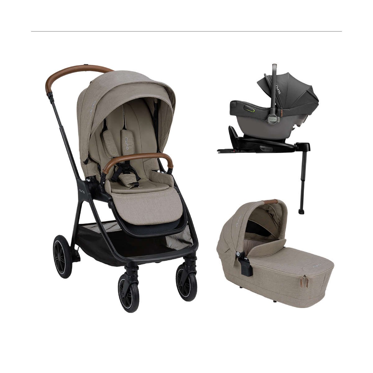 Package Includes: Nuna TRIV Next Hazelwood Stroller Nuna TRIV Next Hazelwood Carrycot Nuna Pipa Next iSize Group 0+ Caviar Car Seat Nuna Base Next Rotating Isofix Caviar Base Nuna TRIV Next Hazelwood Stroller: A morning stroll to the park or afternoons in your favourite coffee spot, every day out and abouts with the baby are fuss-free with the TRIV? next pushchair. It?s a natural city dweller that quickly converts to a travel system, packs up easily and stands on its own when folded, becoming the perfect sidekick to your everyday adventures. Engineered for convenience and comfort, the all-wheel suspension, one-touch braking system, and large rear wheels promise easy manoeuvrability and cushiony smooth city strolls – like riding on air with complete peace of mind. This compact fold pushchair is cleverly designed with a seat that faces and folds both ways, no matter what direction the baby’s facing. The all-season seat keeps your precious cargo snug in winter and converts to breathable mesh in summer, while the rain cover provides extra protection no matter the weather. Features: Recommended use: Birth to 22kg Seat faces both ways and easy to fold flat, whatever direction baby?s been facing Spring suspension seat technology for smooth rides Magne Tech secure snap? – the self-guiding magnetic buckle that automatically locks into place Dimensions: Product: L85cm x W57. 5cm x H105. 5cm Product Folded: L31. 5 x W57. 5 x H69 cm Product weight: 9. 15kg (8. 72 w/o insert & armbar) Nuna TRIV Next Hazelwood Carrycot: On its own, the TRIV carry cot offers the perfect comfy-cosy refuge for a resting newborn. Attached to the TRIV series pushchair, it becomes a stylish pram that?s perfect for quick trips to the corner store or longer journeys across town. The TRIV carry cot easily and securely attaches to the TRIV pushchair frame using the compatible post adapter that is included with the pushchair. Its smart design allows for a restful lie-flat position ? which is best for a newborn?s d