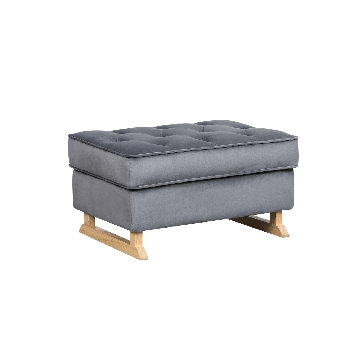 The Nursery Collective Footstool Midnight Grey Natural is the perfect accompaniment to the stunning rocking chair. Fully upholstered in a luxury velvet style fabric, the new Nursery Collective Footstool coordinates perfectly with the existing collection of nursing chairs already available. A footstool provides a comfortable place to put your feet whilst relaxing in the chair. Comfortable to use when the chair is in either rocking or static mode. The footstool features clever and useful storage with a quiet gas lift hinge to easily open and close. Designed not only for enjoying with your baby during those first years but also to become a piece of furniture you keep and cherish forever in your home. FEAURES: Made using a luxury plush velvet style fabric Available in a range of stunning colours to suit any nursery and home interior A comfortable place rest your feet whilst nursing and comforting your little one Beautiful pin tuck detailing Quiet and smooth gas lift dual hinge opening Generous internal storage Choose from white or natural legs Available in a selection of stylish colours to suit any nursery and home interior. DIMENSIONS: Stool 72 x 49 x 40cm (L x W x H) Internal storage 60 x 39 x 14cm (L x w x H) Fabric 100% polyester with lacquered natural coloured rubberwood static legs, timber frame.